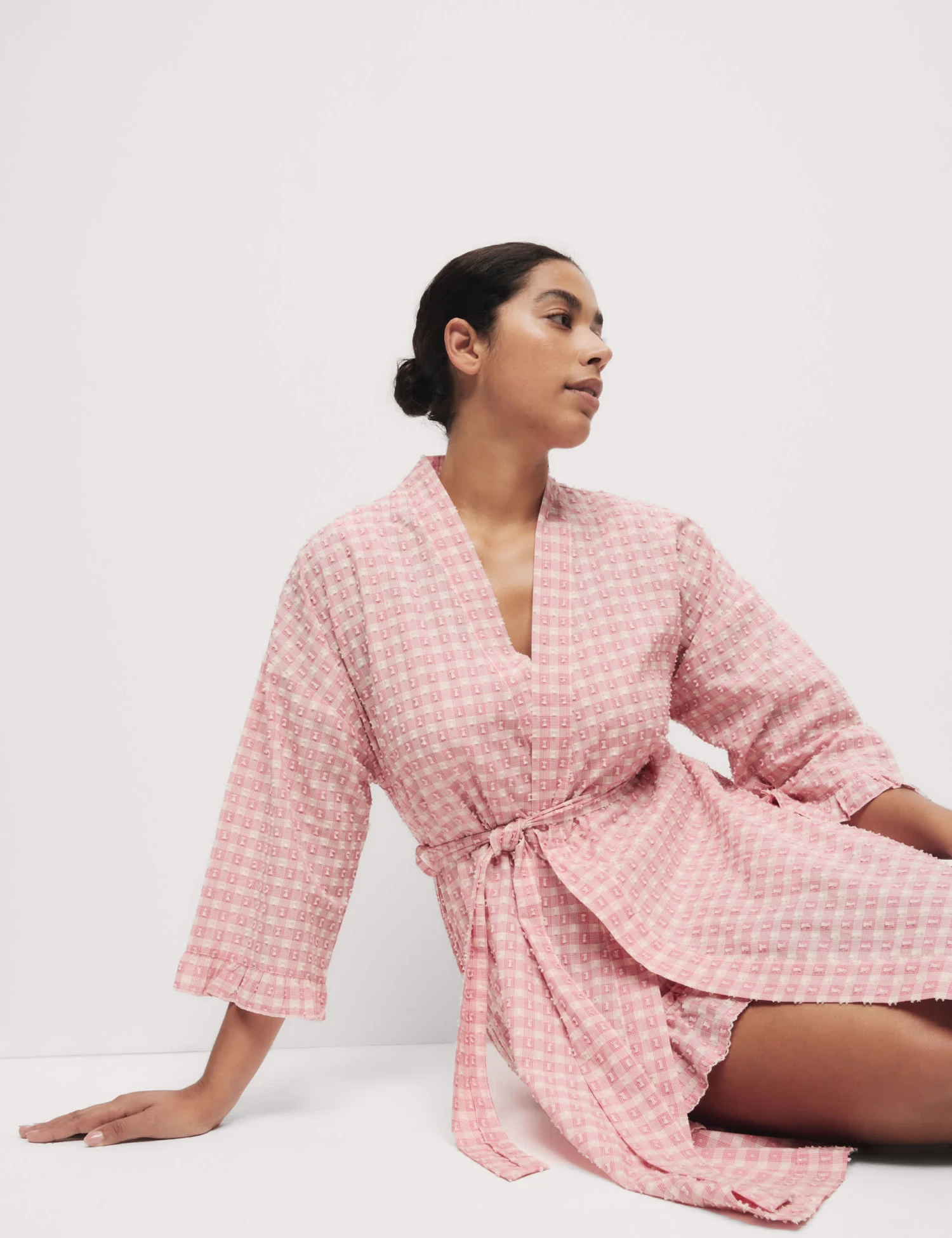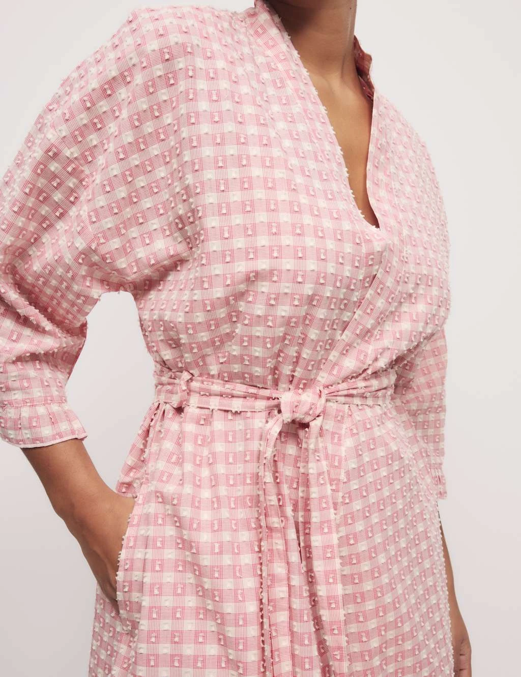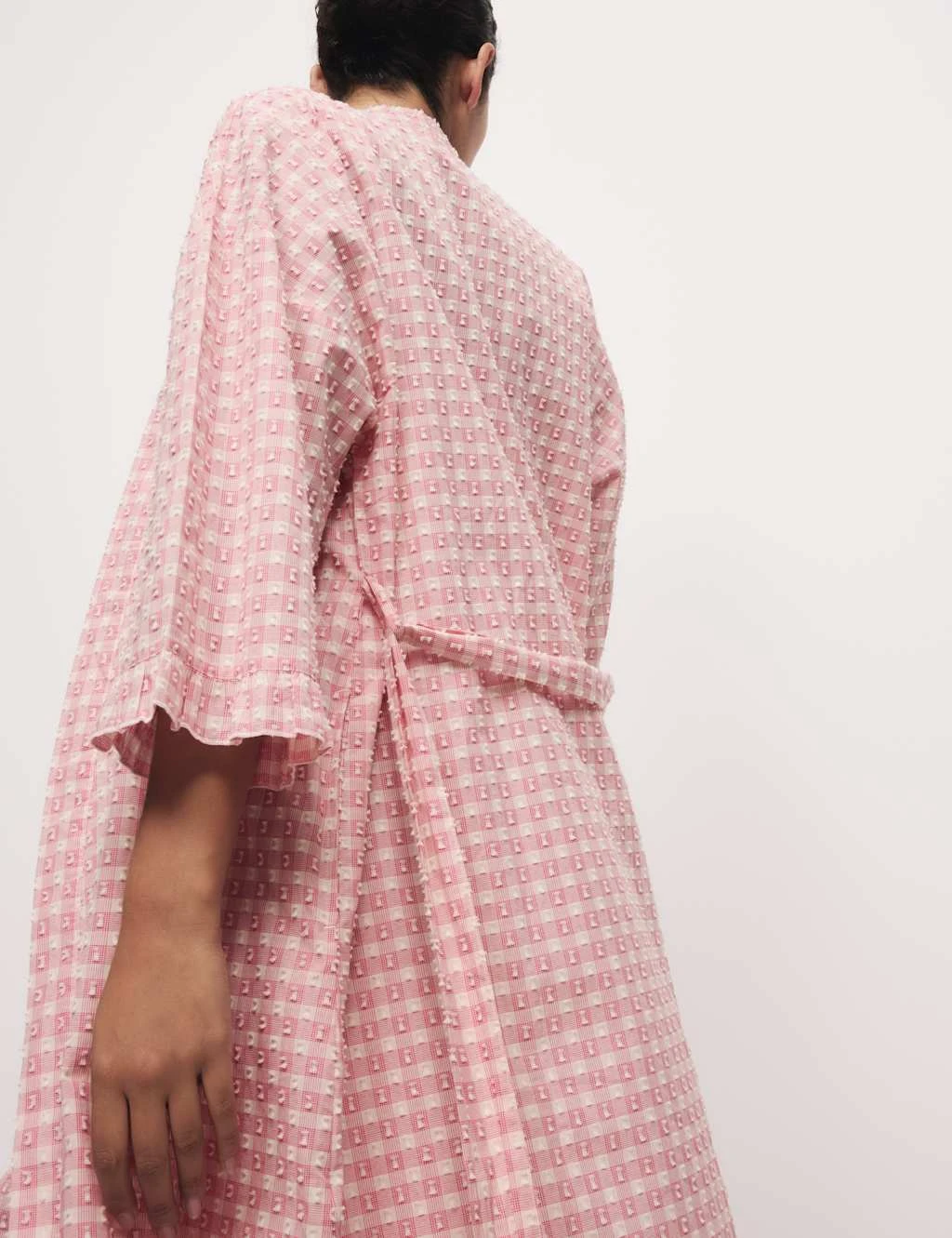 Crafted from pure cotton fabric, this wrap provides a light extra layer for warmer days. Comfy regular fit, with a long hemline for good coverage and an adjustable self-tie belt. Its yarn-dyed gingham check is complemented by an all-over dobby texture. Frill trims at the cuffs add playful detail. M&S Collection: versatile styles in modern shapes with unique and playful details.