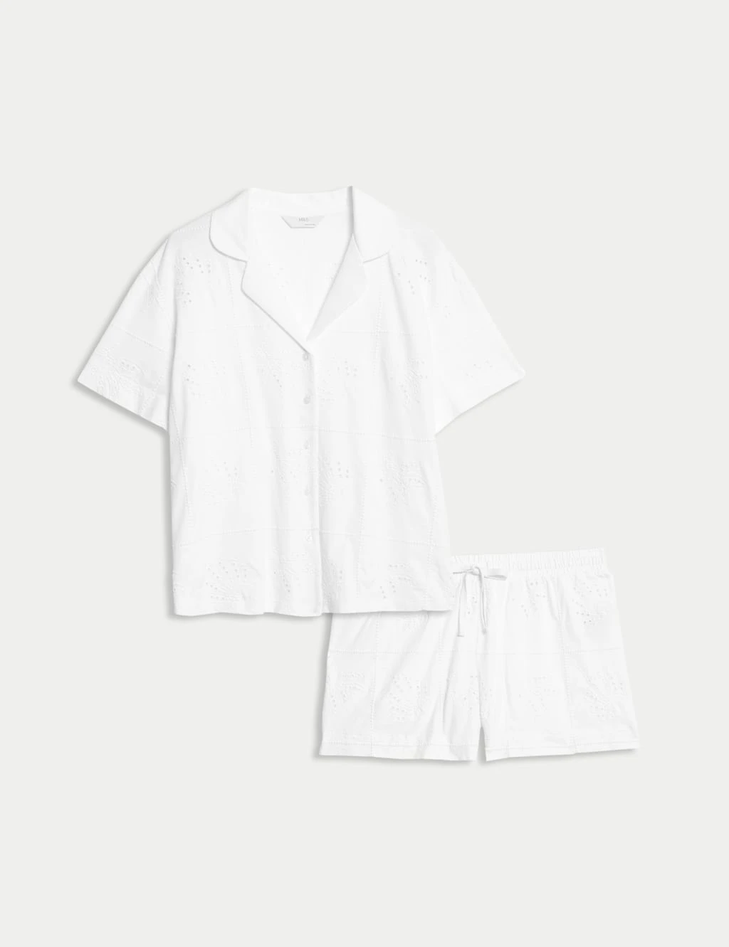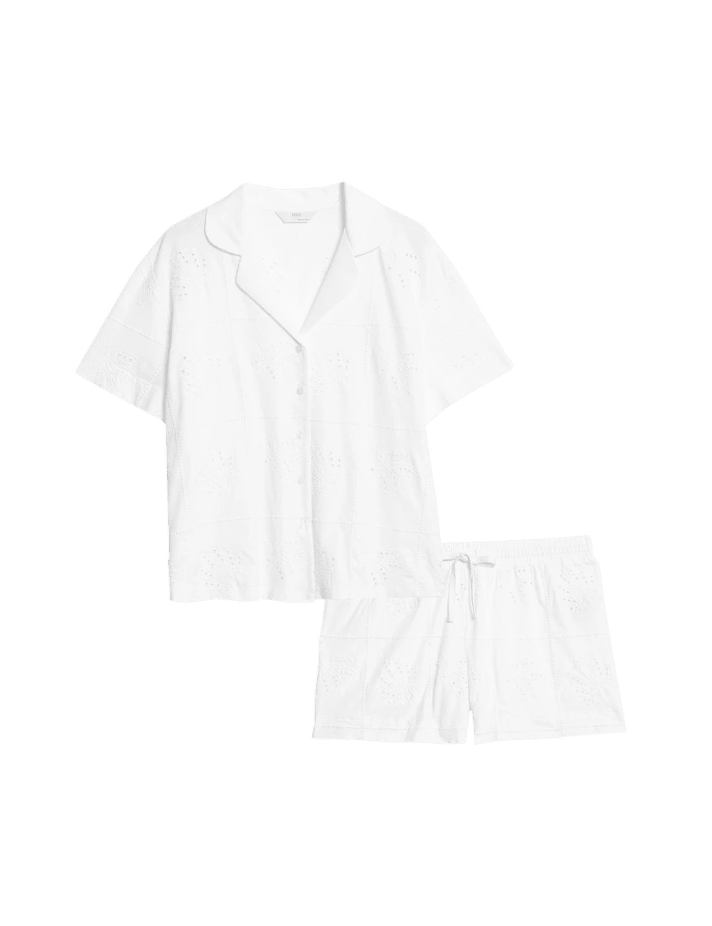Keep your cool on warmer nights in these shortie pyjamas, crafted from pure cotton jersey. Comfy regular fit, with short sleeves and legs. The button-through top has a smart revere collar, while the bottoms have an adjustable drawcord at the waist. All-over tonal embroidery adds delicate detail. M&S Collection: versatile styles in modern shapes with unique and playful details.