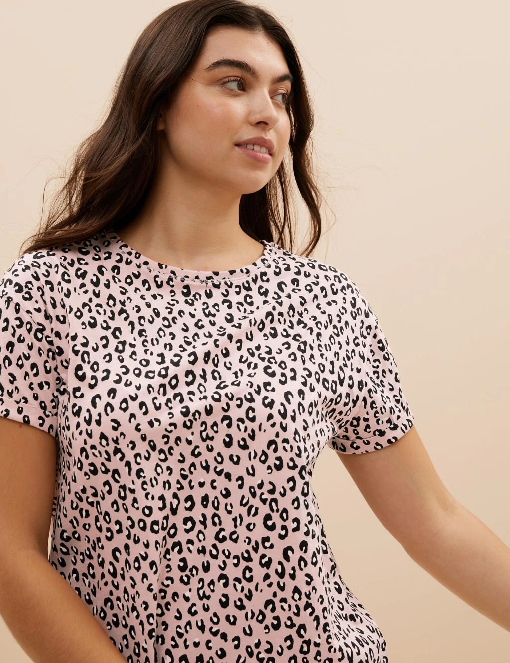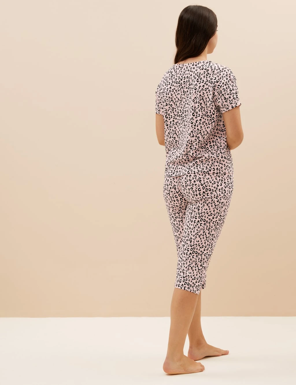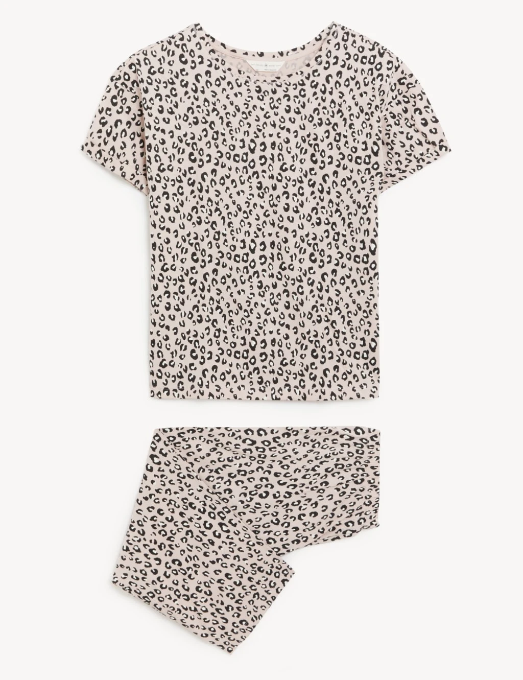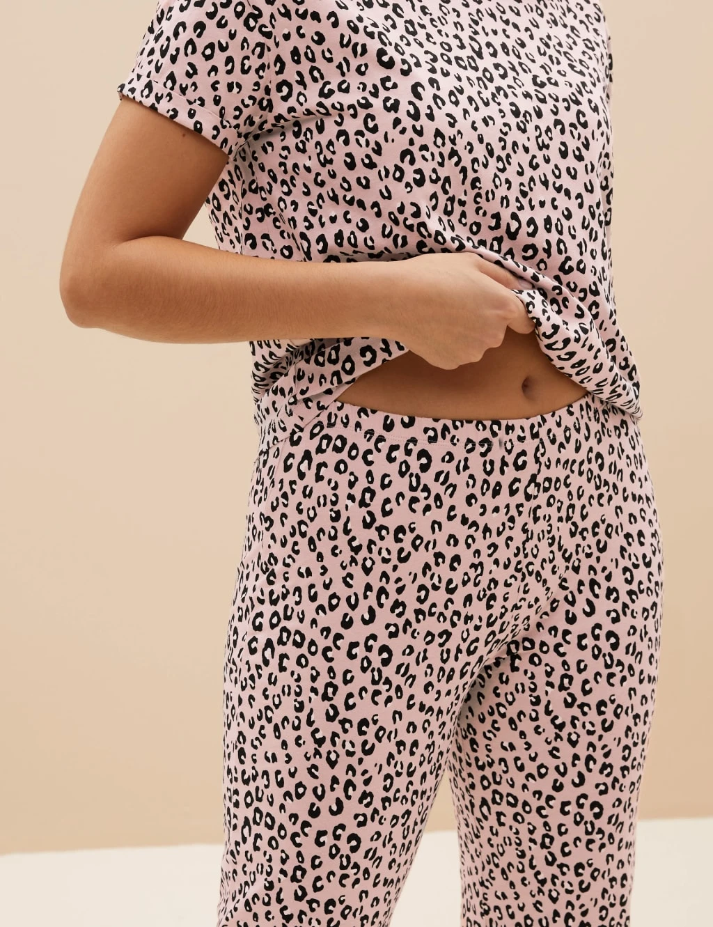 With their bold leopard print, these pure cotton pyjamas ensure a standout look. Regular fit, with short sleeves and cropped bottoms for a playful feel. An elasticated waistline gives easy comfort. M&S Collection: versatile styles in modern shapes with unique and playful details.