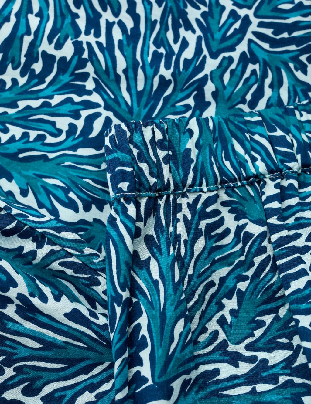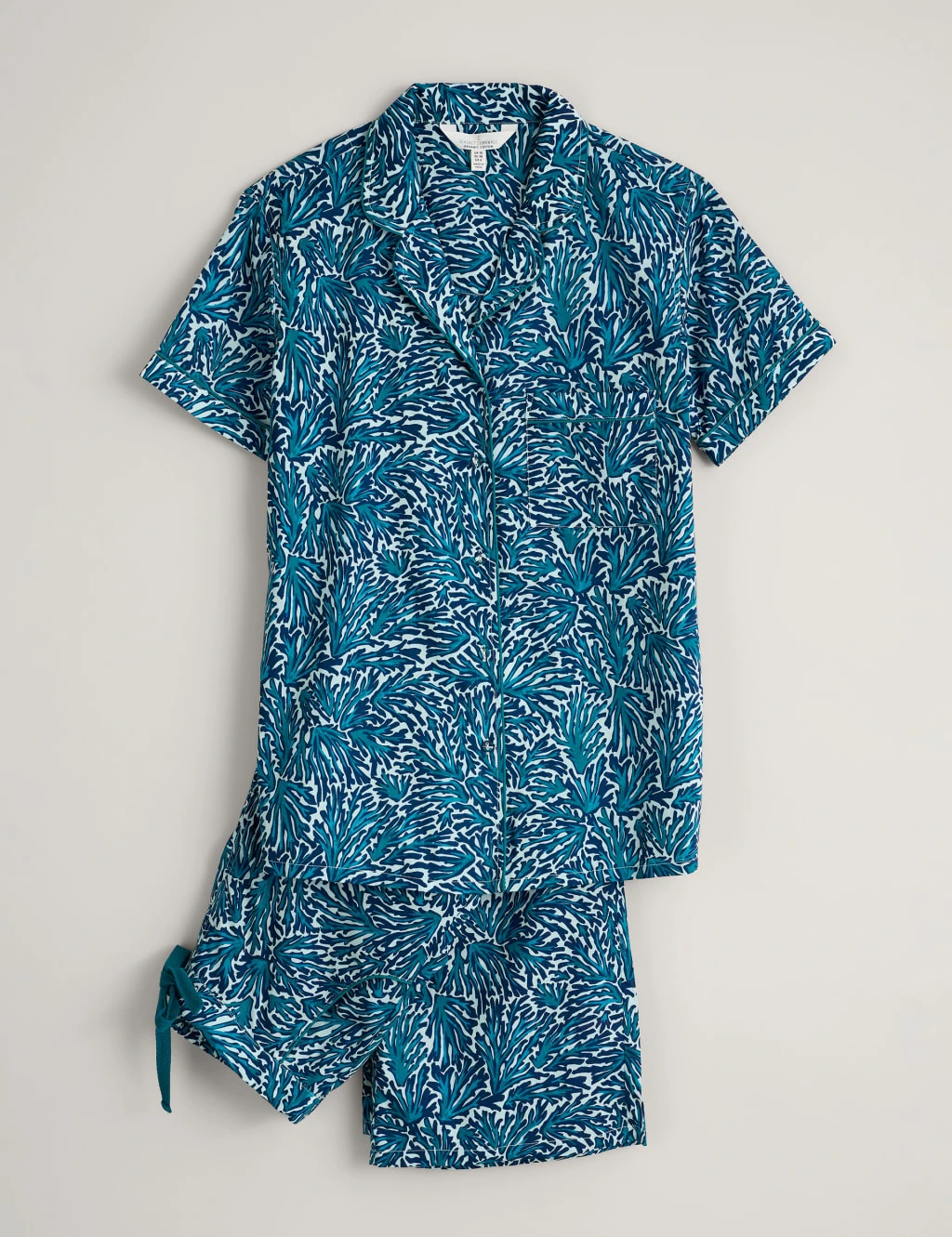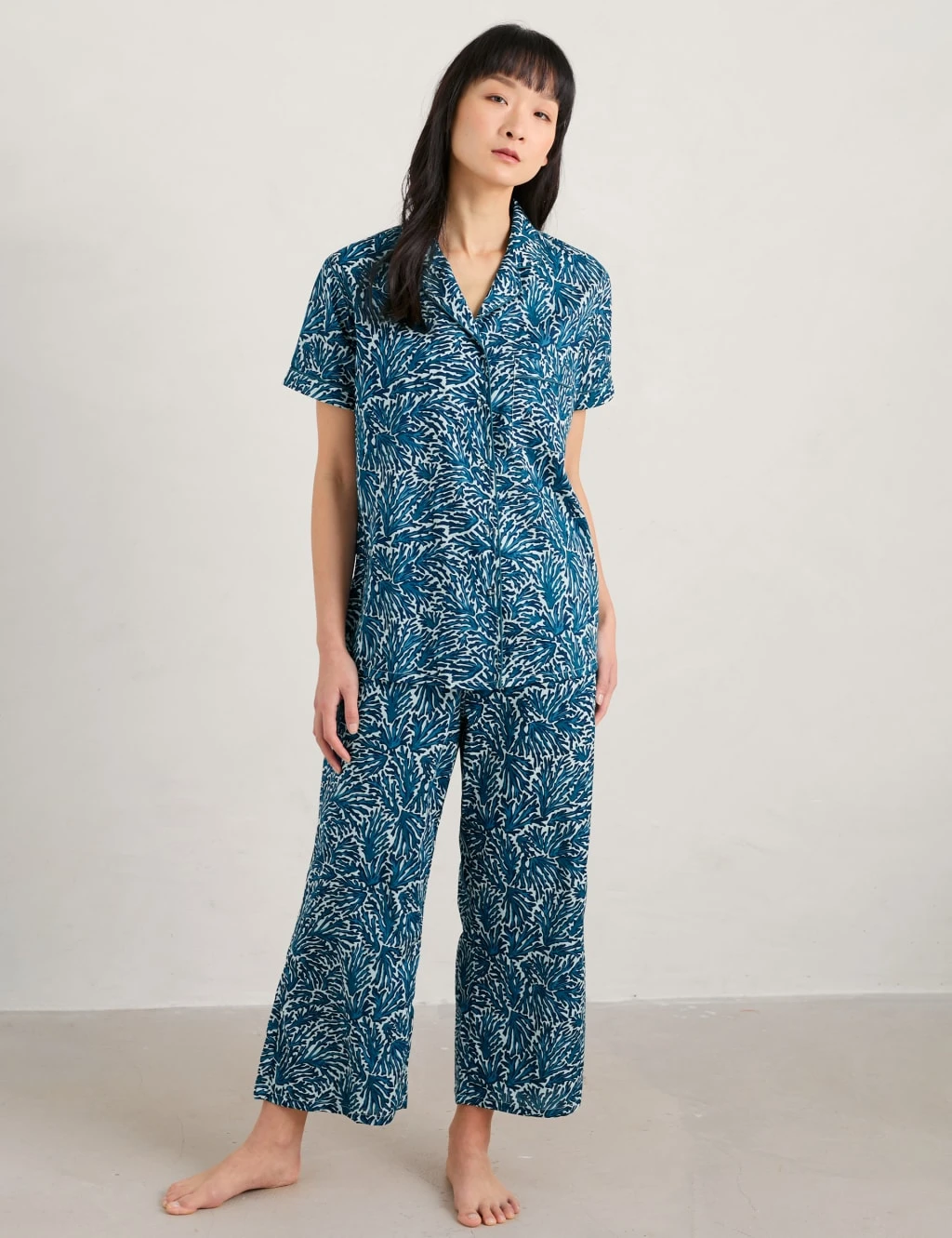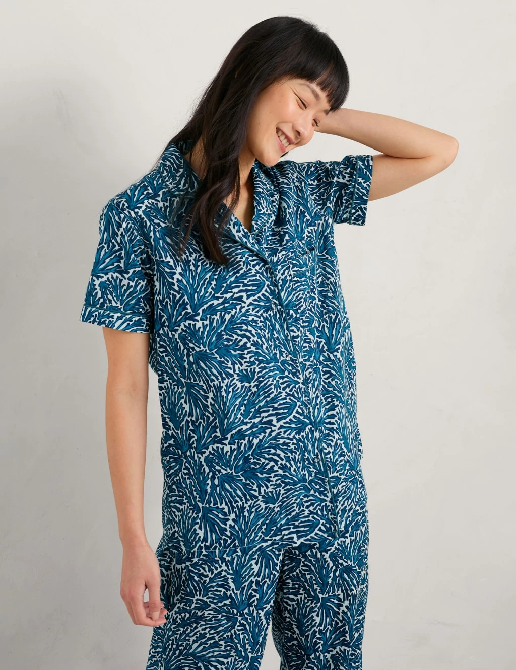 Crisp pure cotton ensures these Seasalt Cornwall pyjamas feel comfortably cool on warm nights. The regular-fit set comprises cropped, wide-leg bottoms and a short-sleeved shirt with a relaxed open-collar neckline. A drawstring waist gives an adjustable fit. The decorative kelp print lends a seaside-inspired charm to the set.