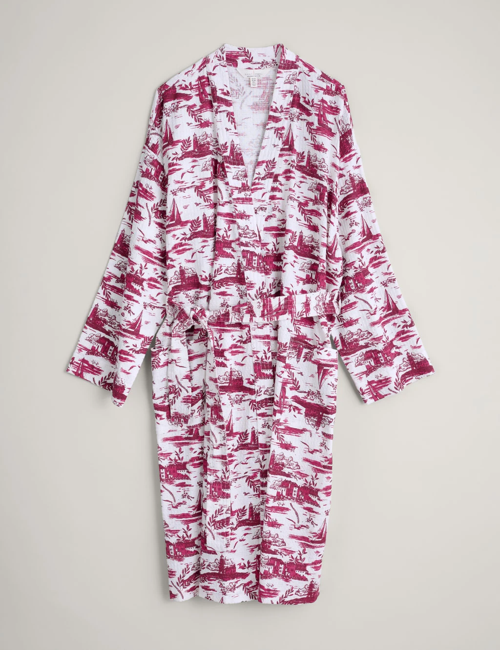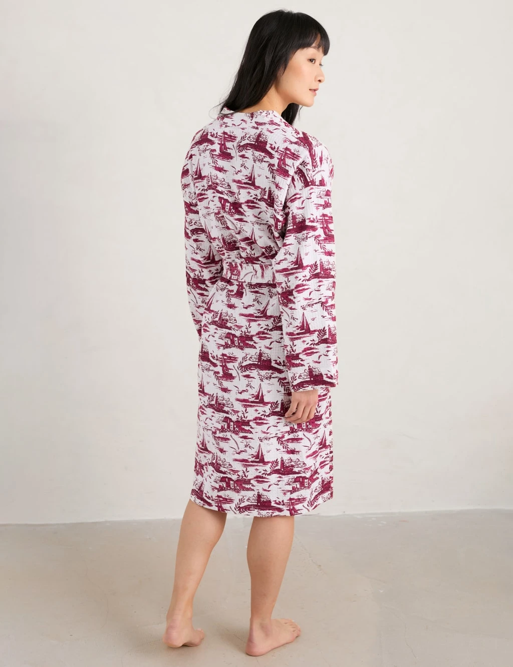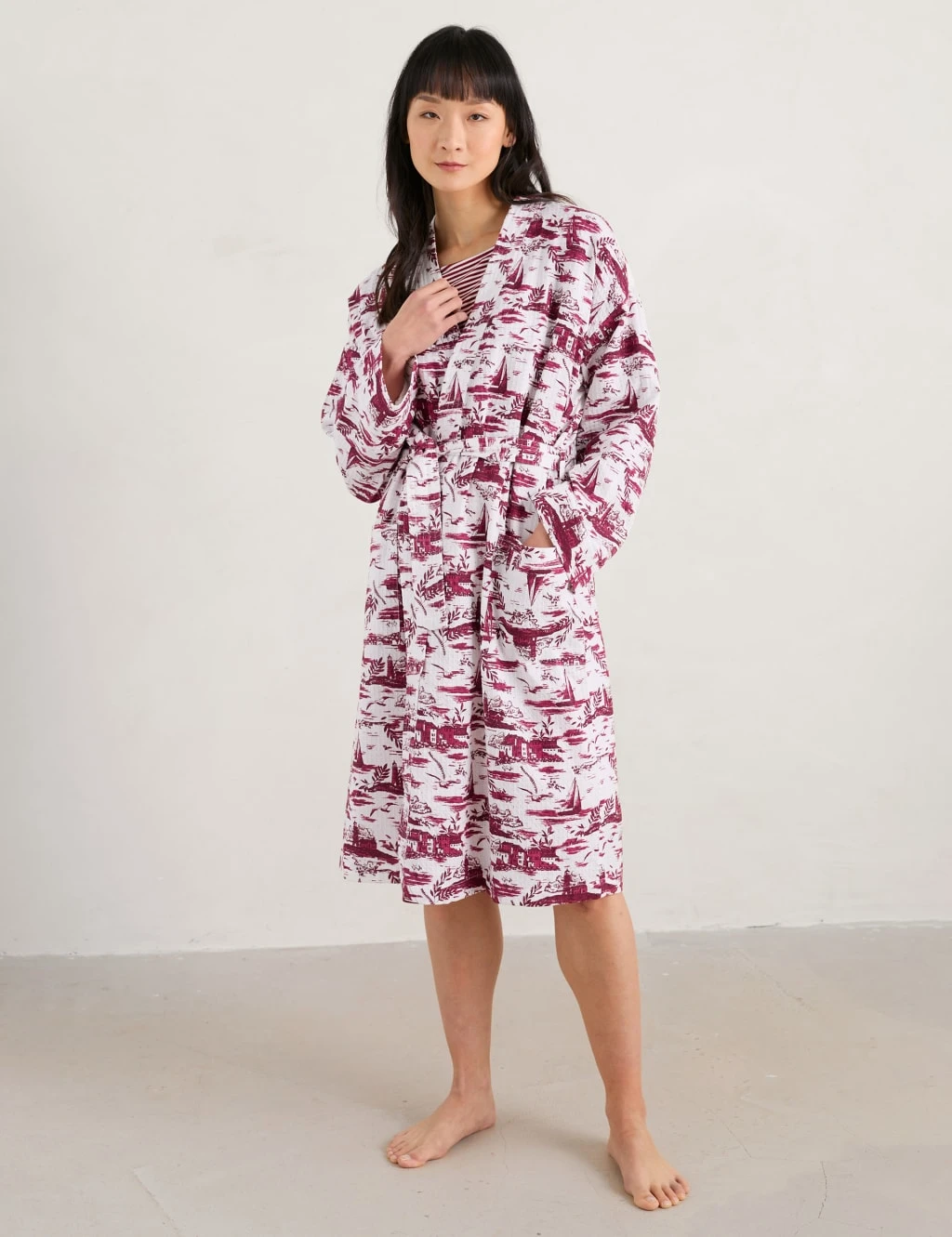 This pure organic cotton dressing gown gives a nod to Seasalt Cornwall’s maritime heritage with its coastal scenery print. It comes in a wrap shape that fastens with a tie belt. Front pockets are handy for those little essentials. The knee-length cut and long sleeves provide comfort and coverage.