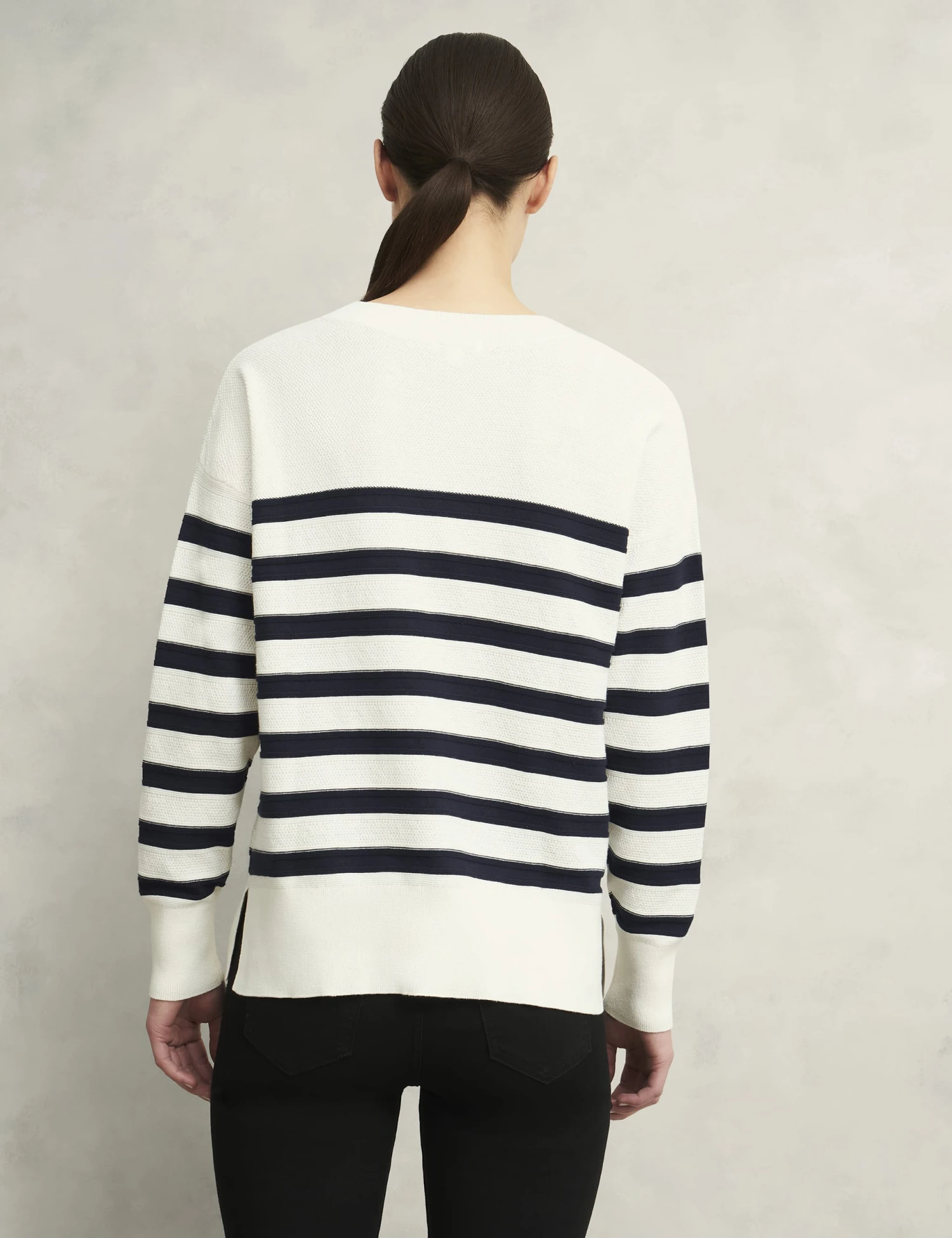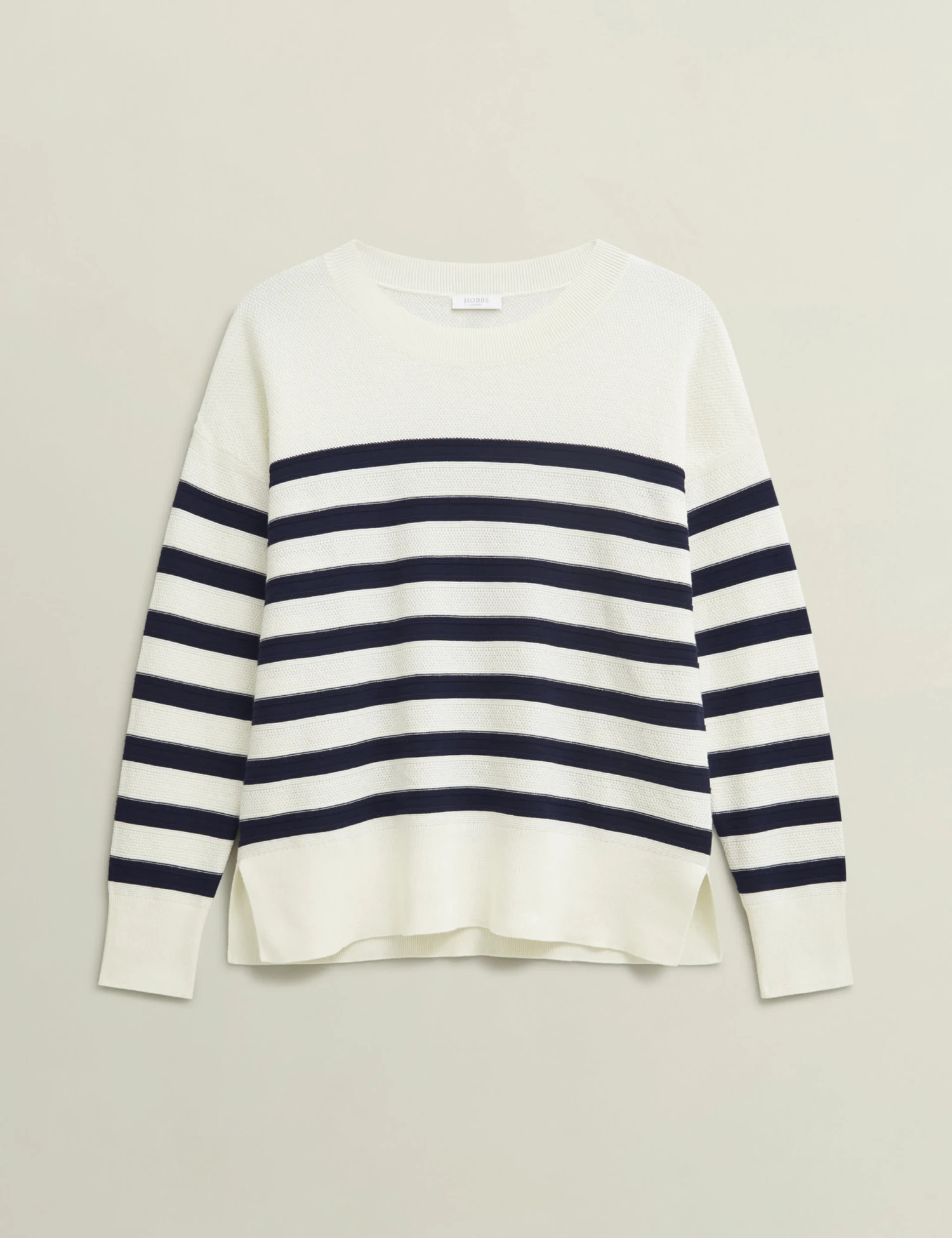 Crafted from pure cotton, this women’s Hobbs jumper offers both comfort and breathability in an enduring design. The regular fit and crew neckline create an effortlessly smart silhouette, while the all-over striped pattern features subtle texture for added visual interest. Casual dropped shoulders and long sleeves ensure everyday wearability, making this sweater perfect for any occasion, complemented by a split hem that makes layering a breeze.