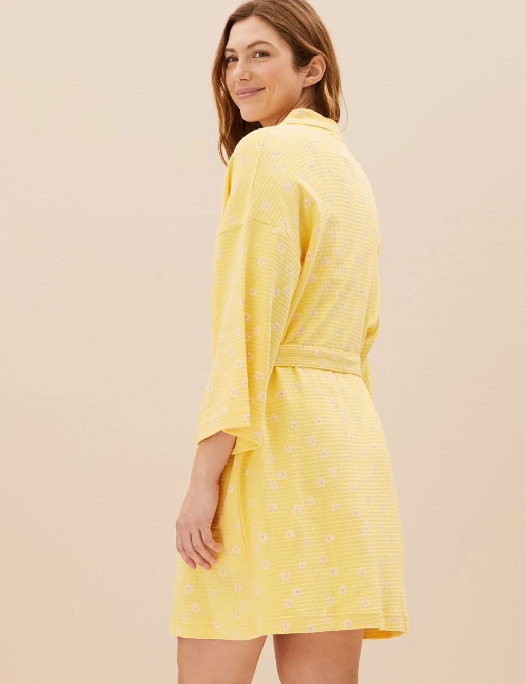 Refresh your loungewear for the warmer months with this pure cotton dressing gown, featuring a summery daisy print. Easy regular fit, with a classic tie-belt fastening and breezy long sleeves. The waffle weave gives the fabric extra texture. It falls to a knee length and features two handy side pockets. M&S Collection: versatile styles in modern shapes with unique and playful details.