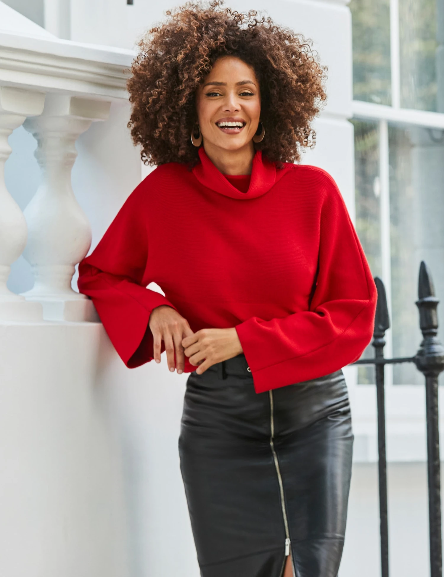 Bring a vibrant feel to your cold-weather outfits with this bold women’s knit jumper from Sosandar. It’s crafted in a regular fit with a cosy funnel neckline and wide long sleeves for an elevated aesthetic. The ribbed knitwear fabric adds texture and visual interest, while providing comfortable stretch for easy wear. This sophisticated pullover sweater offers the perfect blend of warmth and refined design for your winter wardrobe.