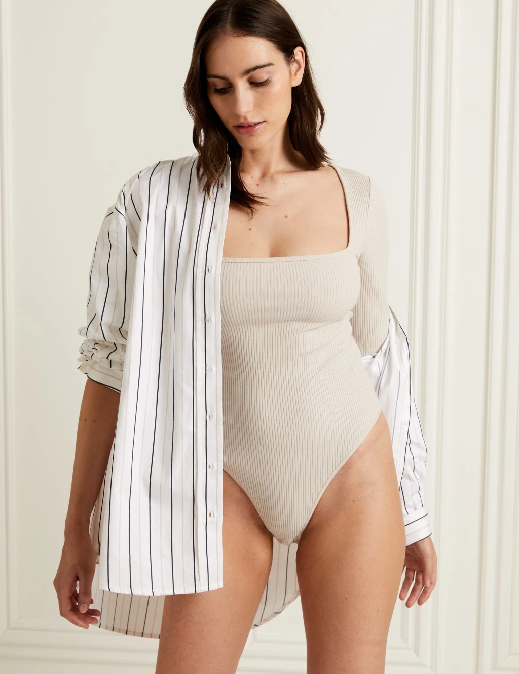 This short sleeved body from our Rosie HomeWear collection is designed with a modern and flattering square neckline. Clever details such as popper fastenings for an easy and adjustable fit and a neat finish on the leg for a clean line under clothes. It features exclusively designed signature rose gold hardware. Rosie HomeWear: contemporary loungewear pieces designed to be styled your way.