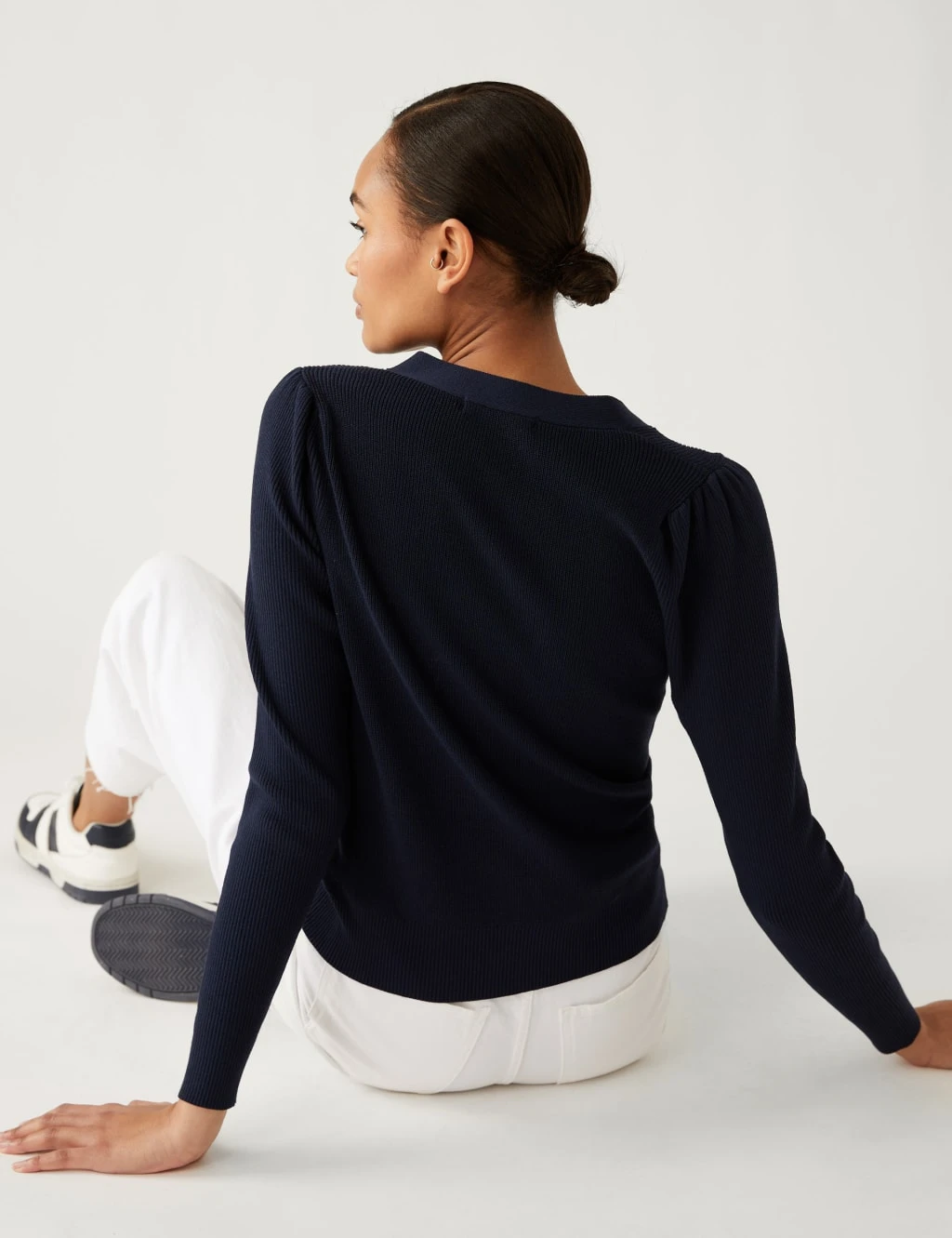 This ribbed cardigan is perfect for transitioning between the colder and warmer seasons. It’s crafted in a regular fit and features a flattering v-neck. The cardigan fastens with buttons down the centre and has tiny pleats on the shoulders for a touch of femininity.