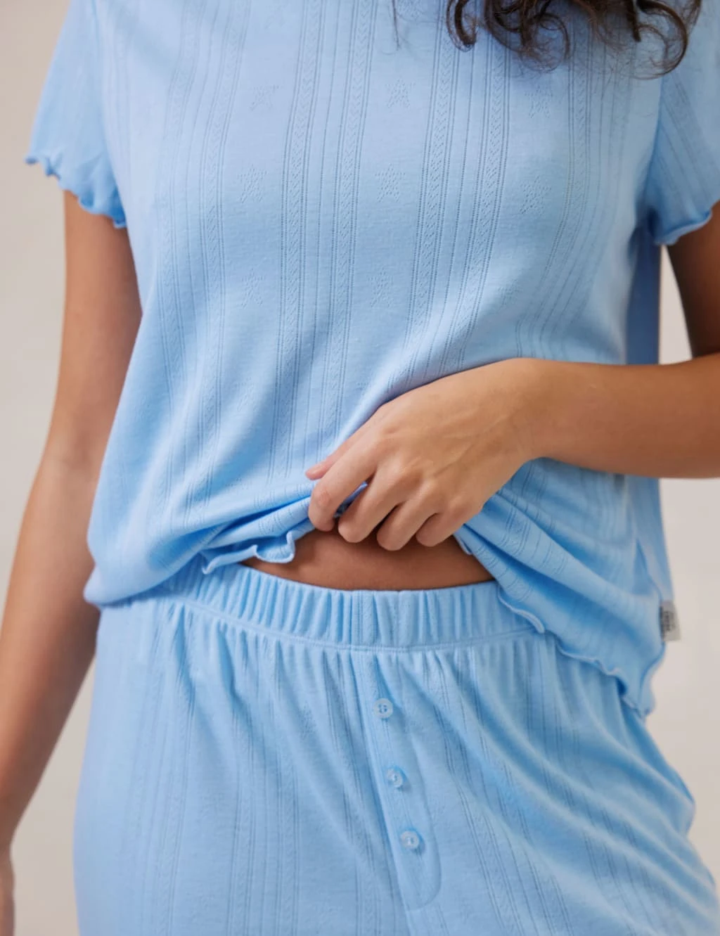 Wavy, ruffled hems add a delicate touch to these soft pointelle pyjamas from Chelsea Peers. This regular-fit set includes a short-sleeved t-shirt with a neat round neckline. The matching full-length bottoms have an elasticated waist for a comfy feel.