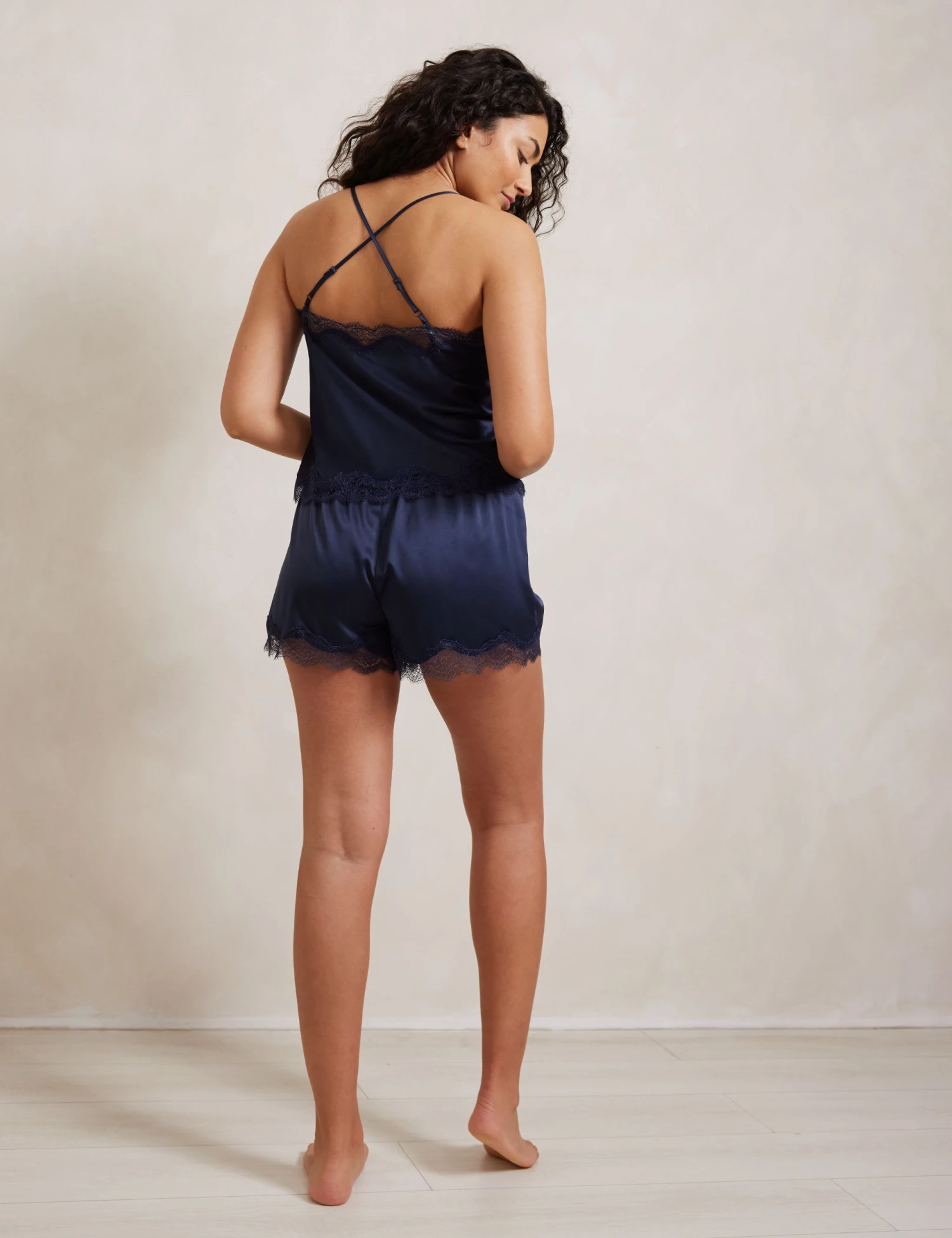 Bring a luxurious feel to your nightwear with this satin pyjama set from Chelsea Peers. Designed in a regular fit, it includes a camisole top and matching shorts, both featuring intricate lace trims for a delicate touch. The cami has adjustable straps, while the elasticated waist on the shorts provides flexible comfort.