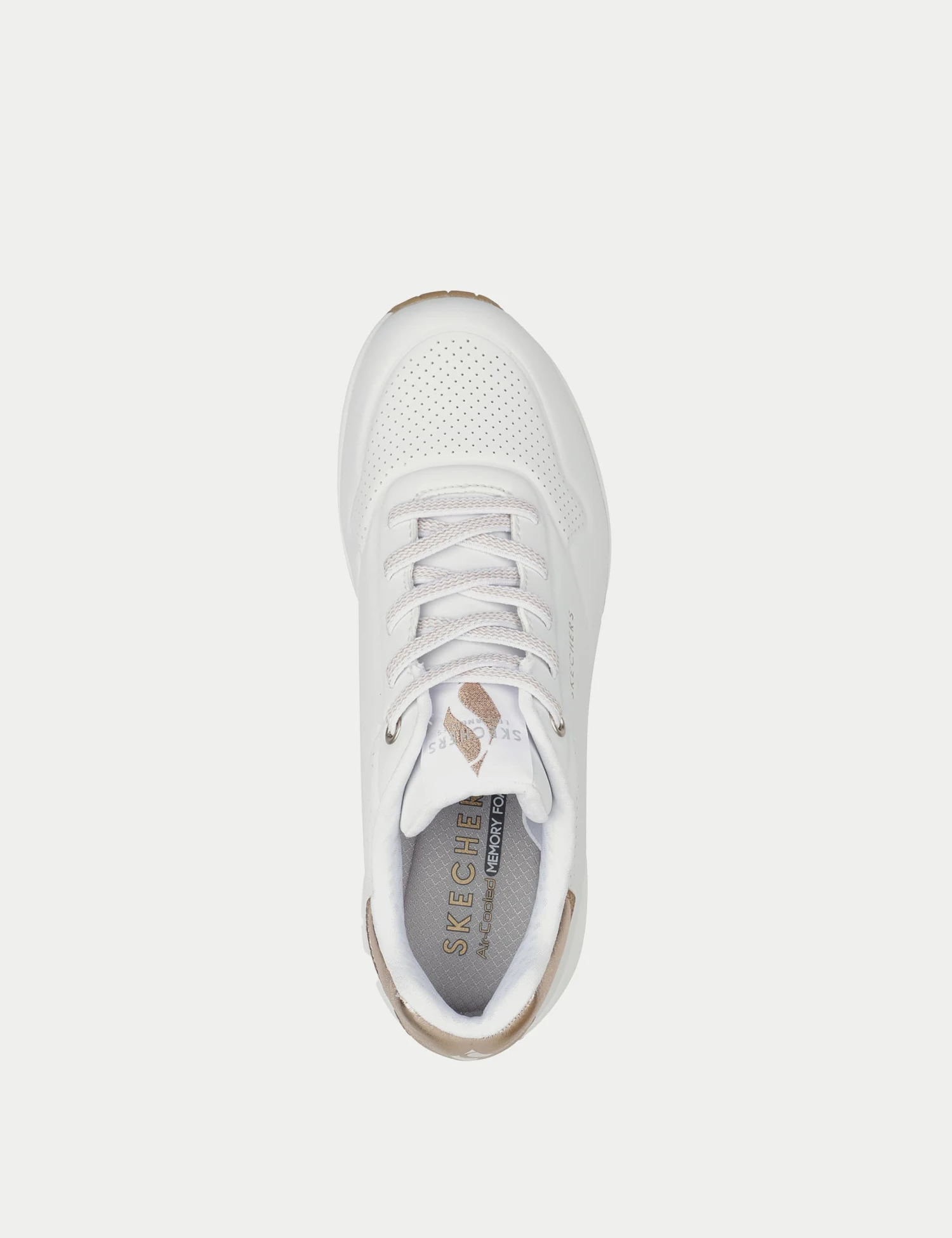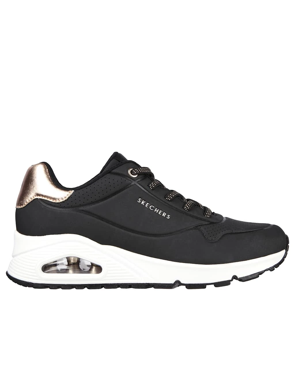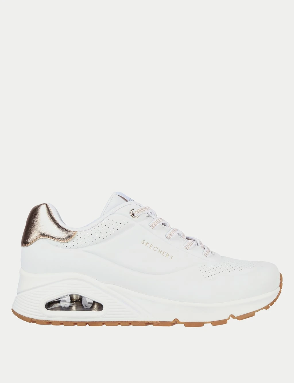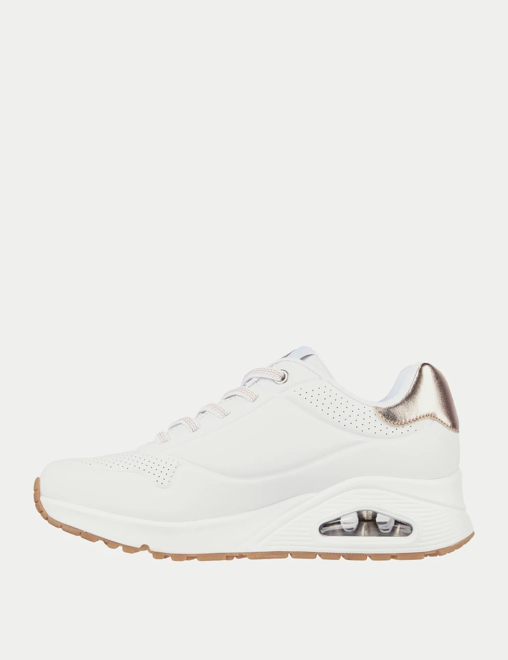 Add some shimmer to your casual edits with these chunky trainers by Skechers. This wide-fit pair has elevating platform soles with visible air cushions in the midsoles to ensure comfortable wear. Perforated panels offer breathability, while cushioning Air-Cooled Memory Foam insoles offer instant comfort and extra support. They’re finished with metallic heel trims for a stylish look.