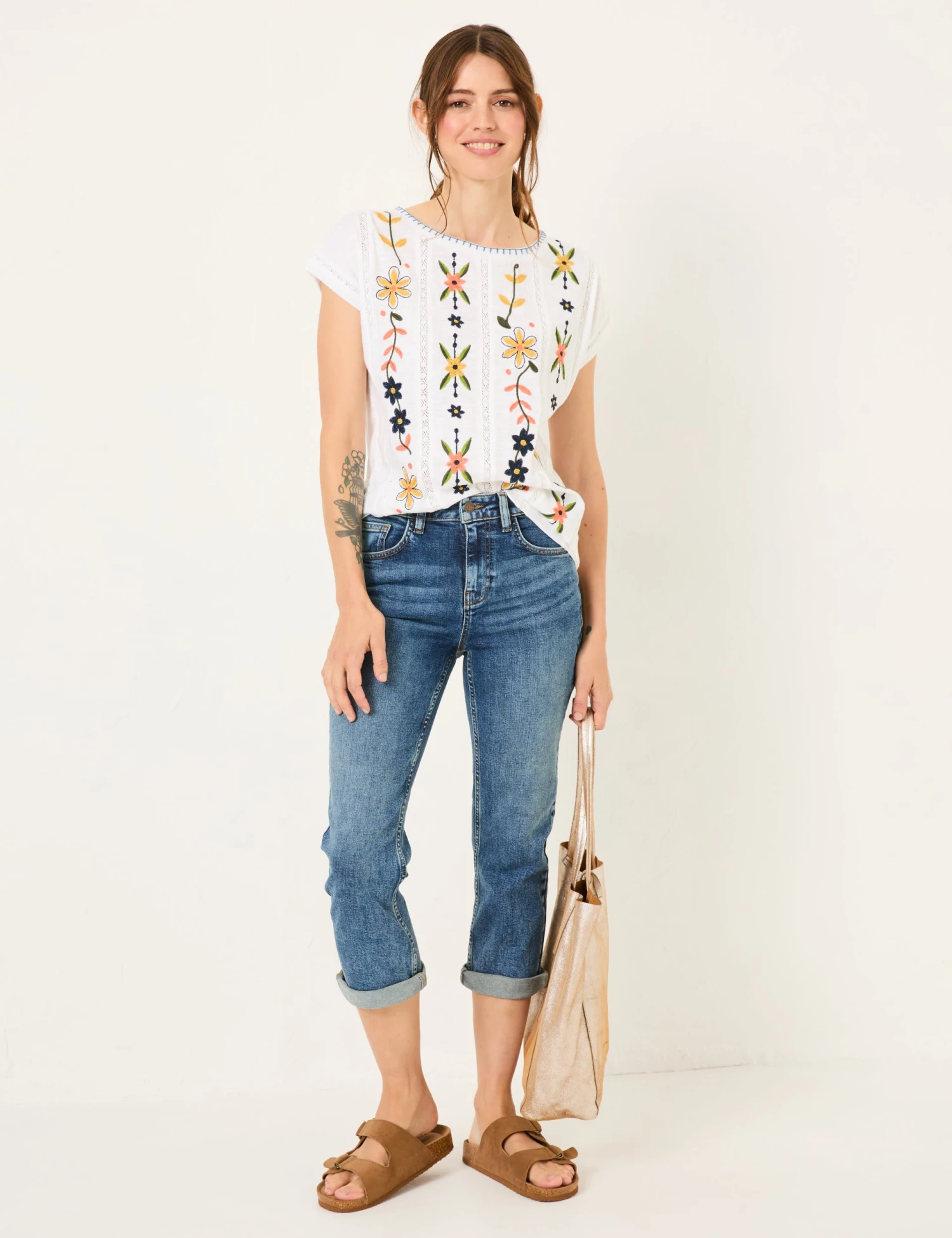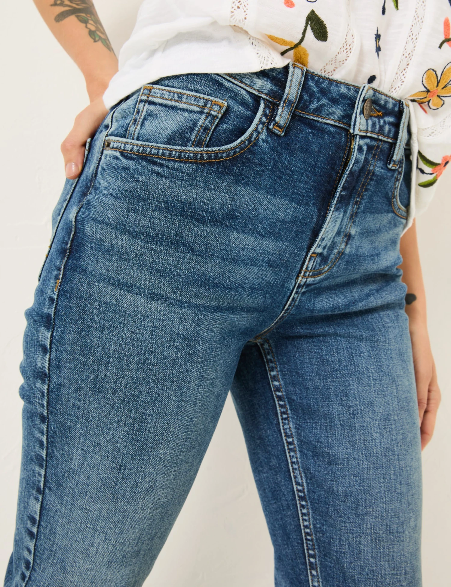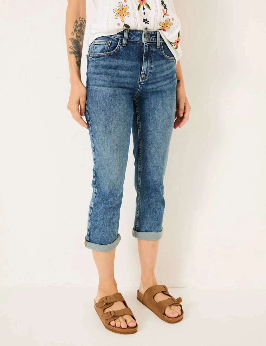 These cotton denim jeans from FatFace are made with a touch of stretch for a flexible feel. They’re cut to a flattering slim fit, with a capri-style cropped leg and turn-up hems to give a modern look. The pair are complete with traditional five-pocket styling and a button and zip fastening.