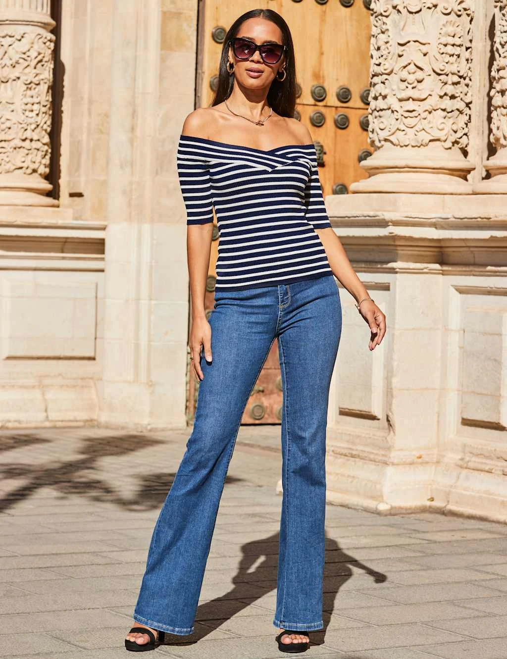 This striped jumper by Sosandar will bring timeless elegance to your knitwear collection. It’s designed in a fitted shape, with an off-the-shoulder neckline for a sophisticated effect. A ribbed texture creates a casual look, while short sleeves provide breathability in warmer weather.