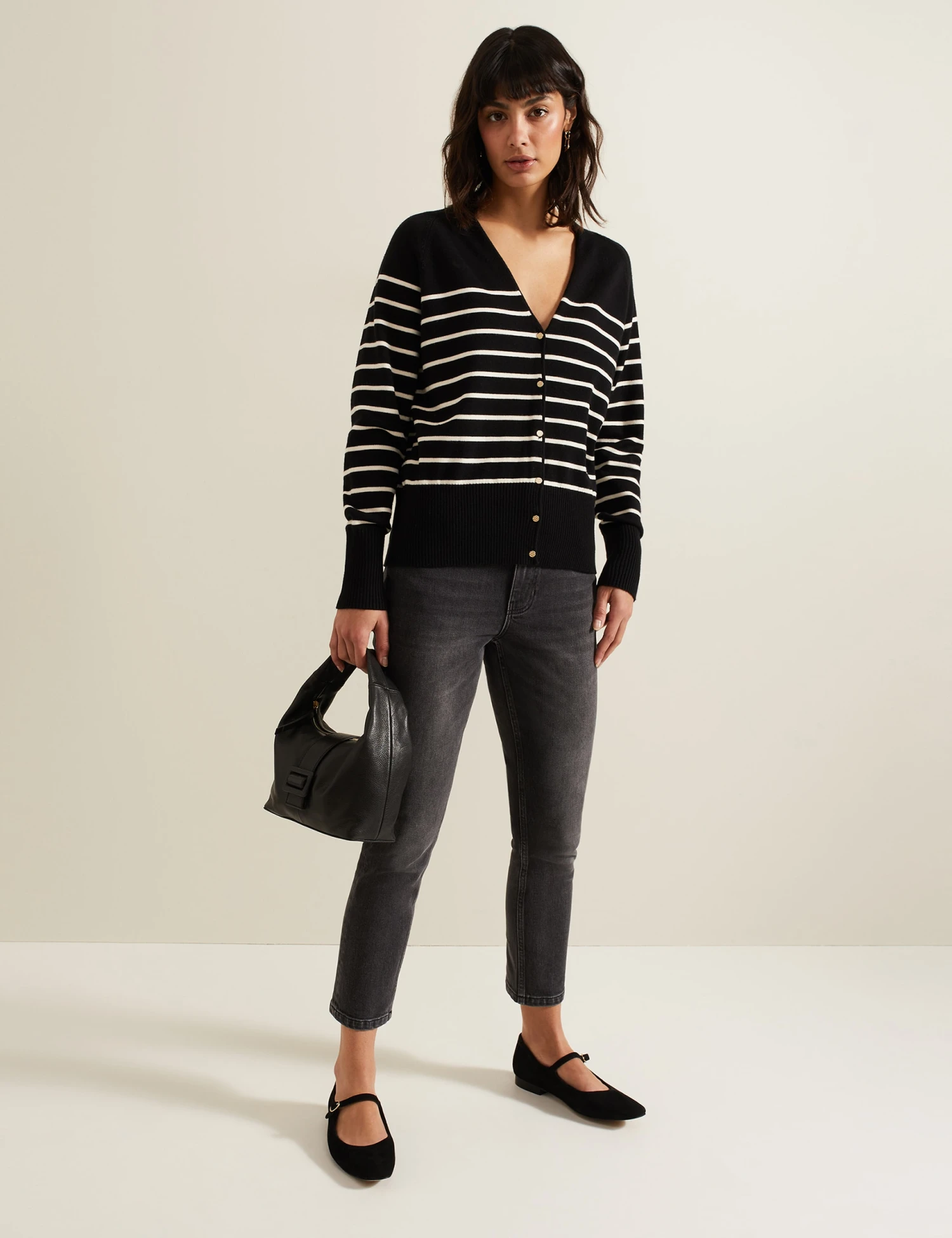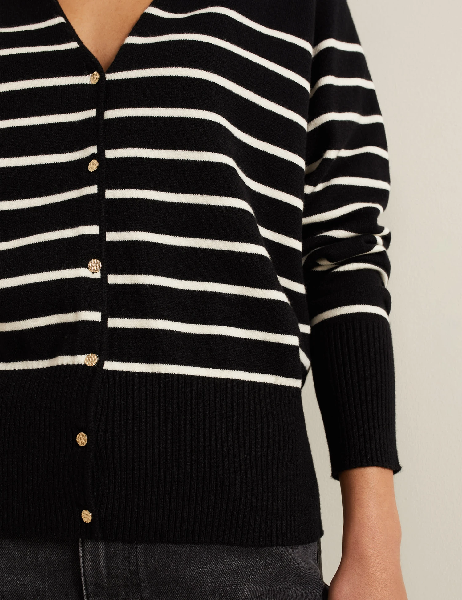 This Phase Eight cardigan is a versatile choice for layering. It’s made in a regular fit from a lightweight knit. The neat button-through style features a flattering v-neckline and a timeless horizontal stripe design.