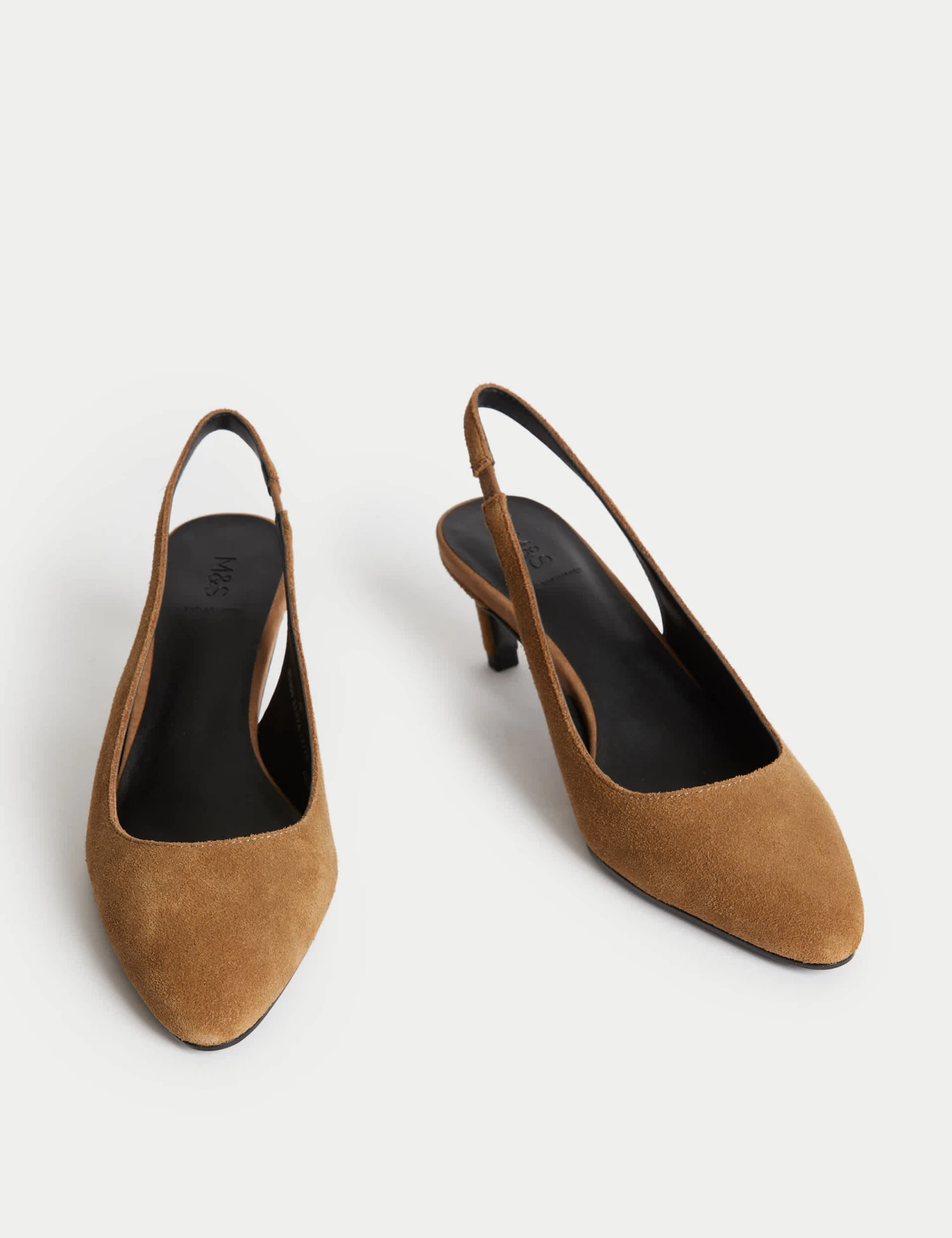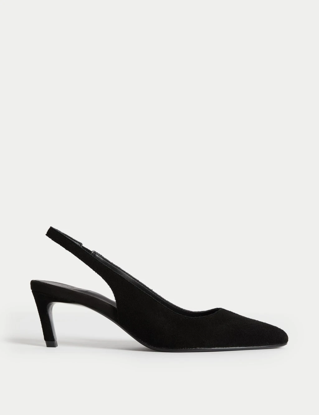 These suede court shoes are an elegant choice for smart occasions. They have a mid-height stiletto heel and a timeless pointed toe. A slingback strap with a buckle fastening keeps them securely in place. Our Insolia® technology redistributes your weight away from the balls of your feet, reducing pressure and increasing ankle stability, allowing you to wear your heels comfortably for longer. Antibacterial padding minimises odour for all-day freshness. M&S Collection: easy-to-wear wardrobe staples that combine classic and contemporary styles.