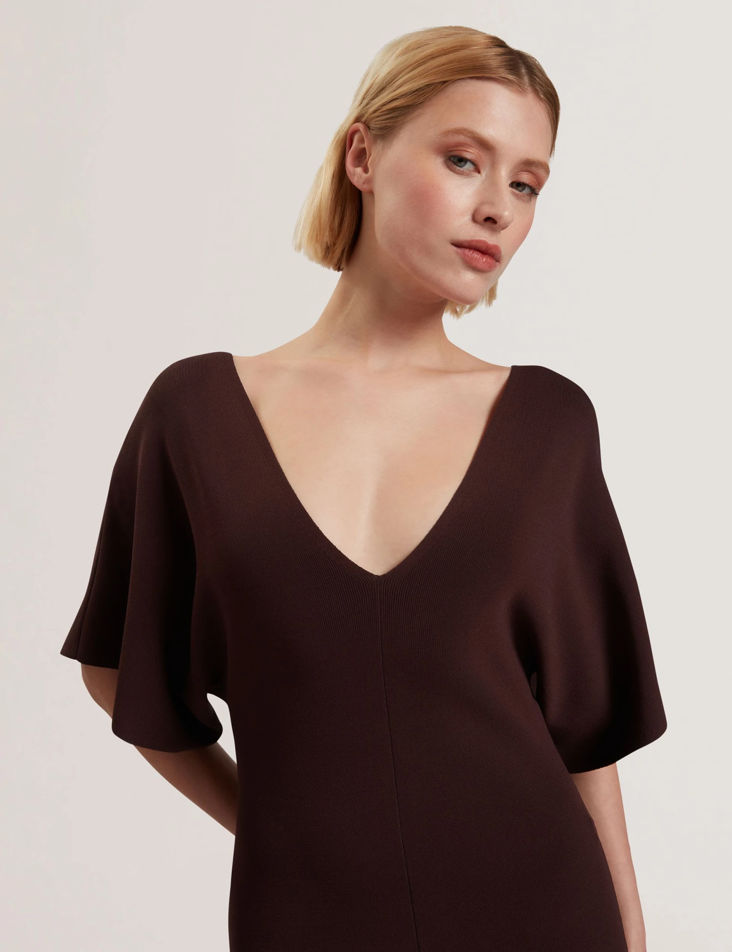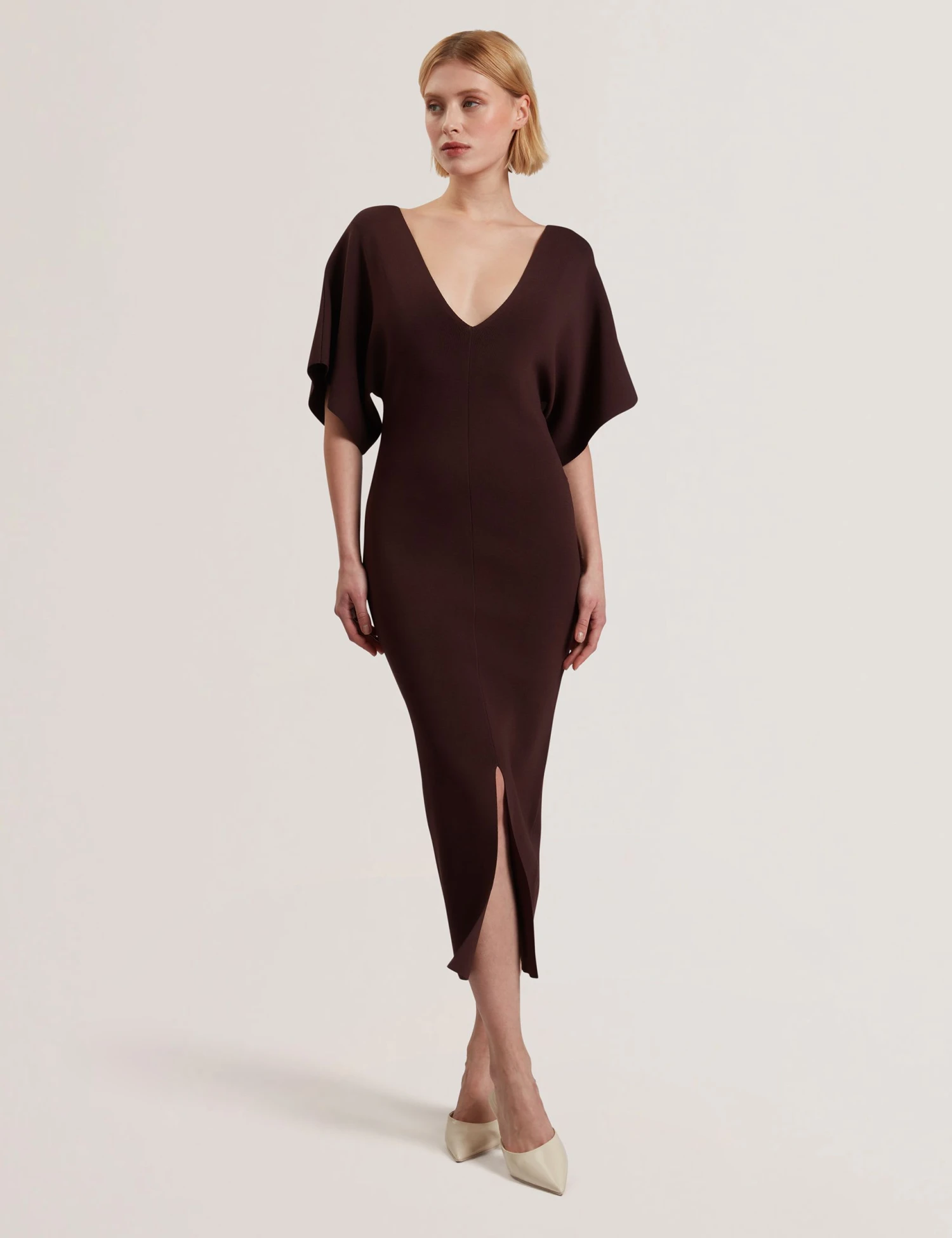 This knitted bodycon dress from Ted Baker showcases a beautiful fluid drape. Made in a regular fit, it features a deep, wide v-neckline framed by short angel sleeves, creating an eye-catching silhouette. An alluring front split in the midi hem allows you to move comfortably.