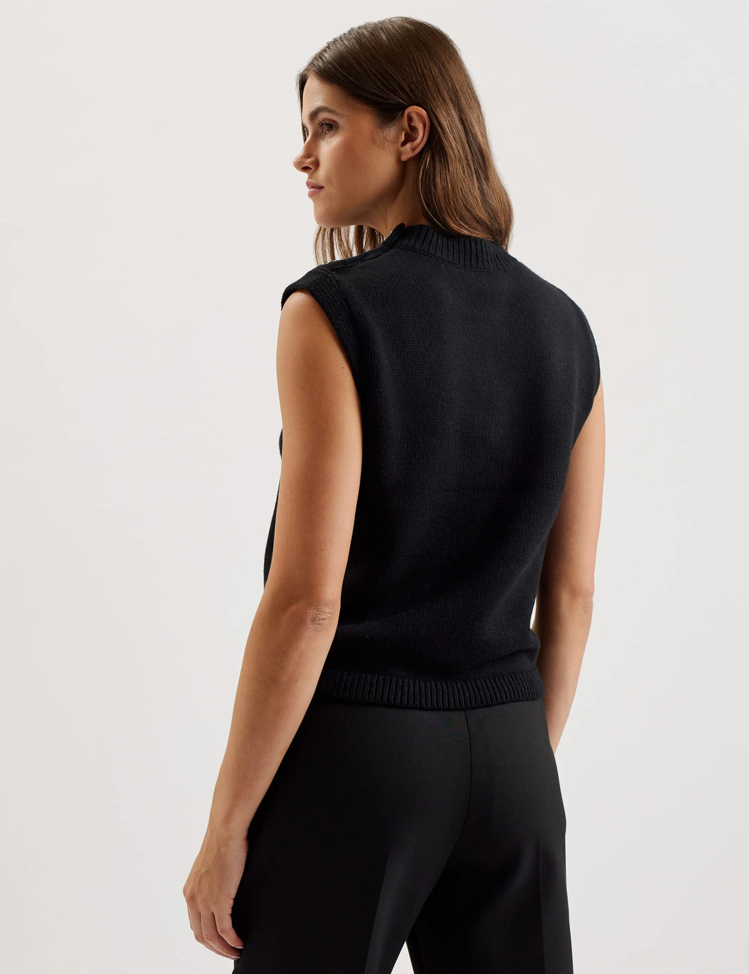 This Ted Baker knitted vest is a versatile layering piece, crafted from a cosy wool-rich blend. It’s designed with a crew neck and a sleeveless silhouette in a regular fit for a traditional look. The hem is ribbed for a neat feel, while the shoulders feature polished rose-shaped buttons for a romantic finish.