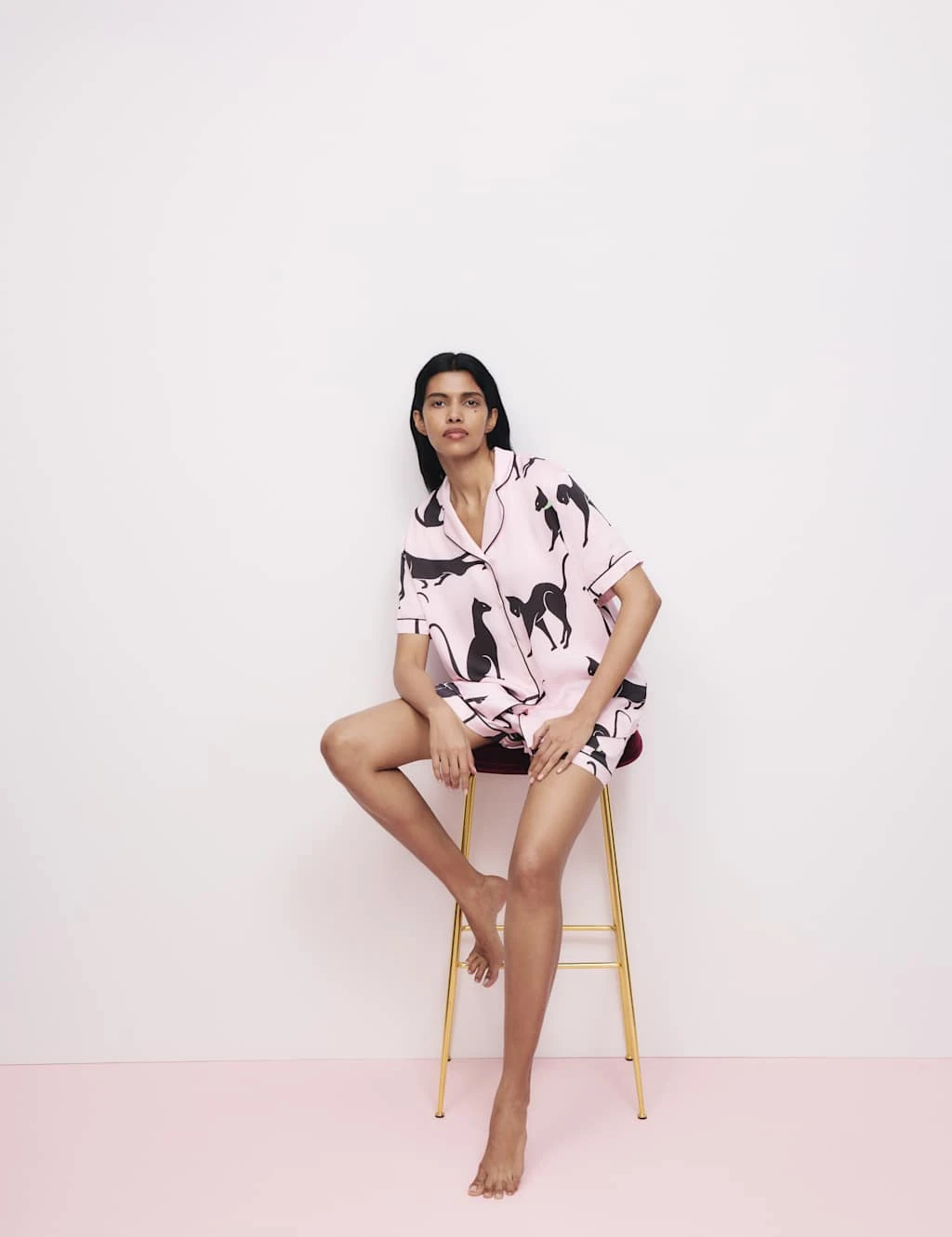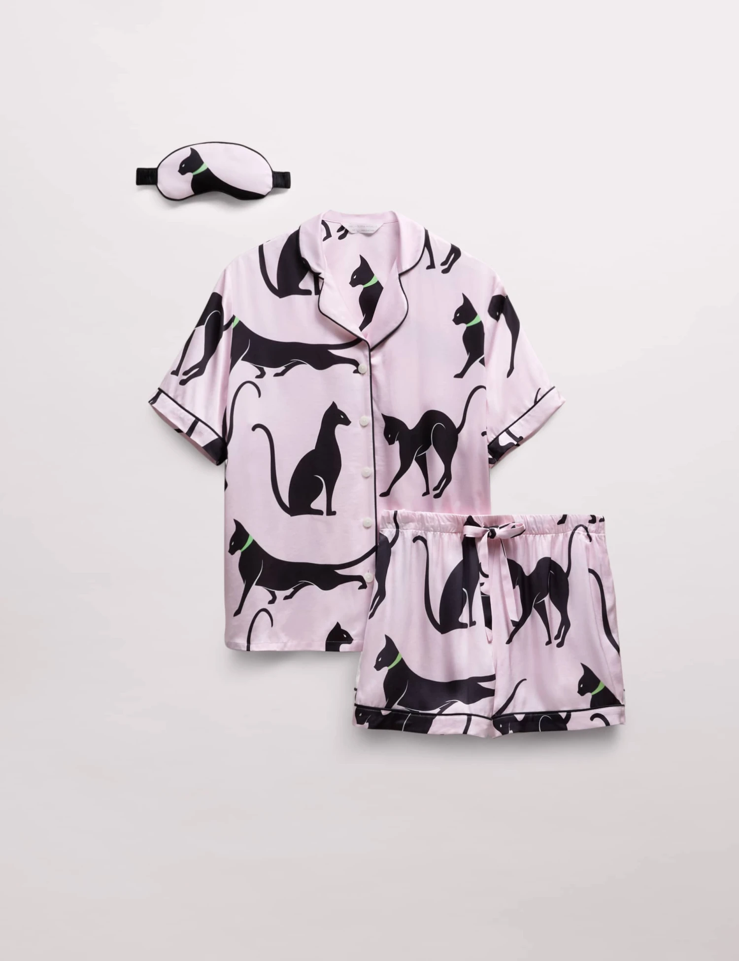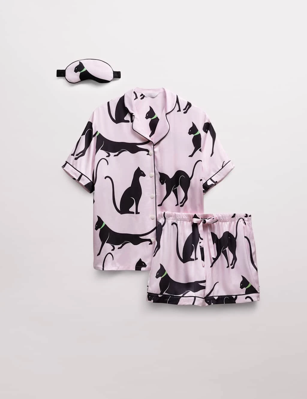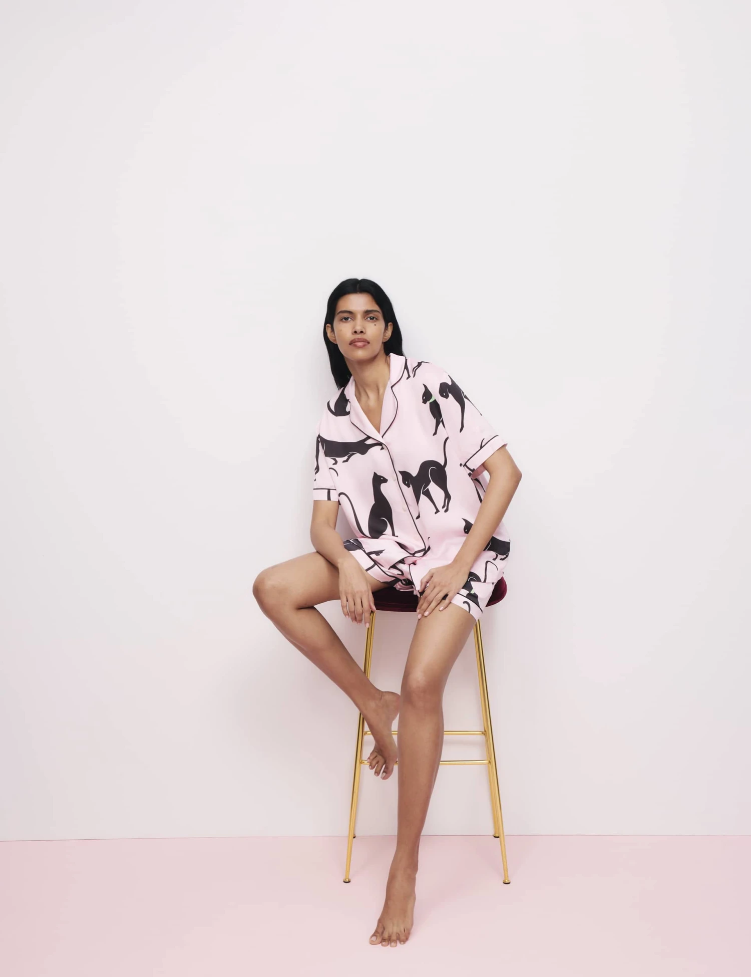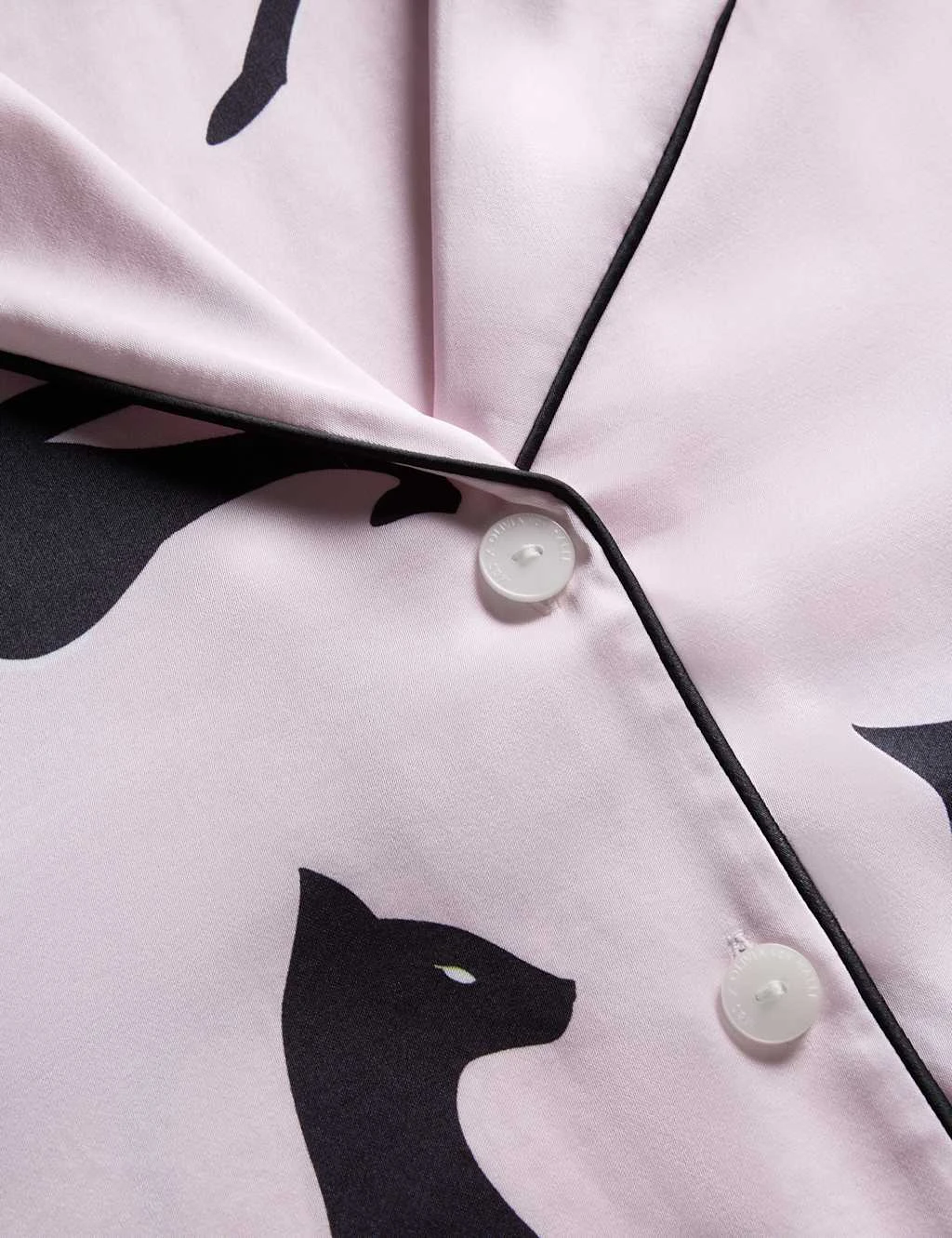 With its iconic cat print, this set from M&S x Olivia von Halle is made for lounging in style. Designed in a regular fit, it comprises a short-sleeved, revere collar top and shorts with a flexible elasticated drawcord waist. The luxuriously smooth fabric drapes perfectly. Contrast piping and branded buttons ensure a refined finish.