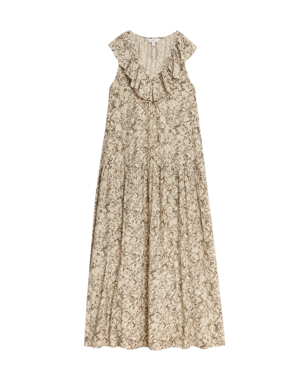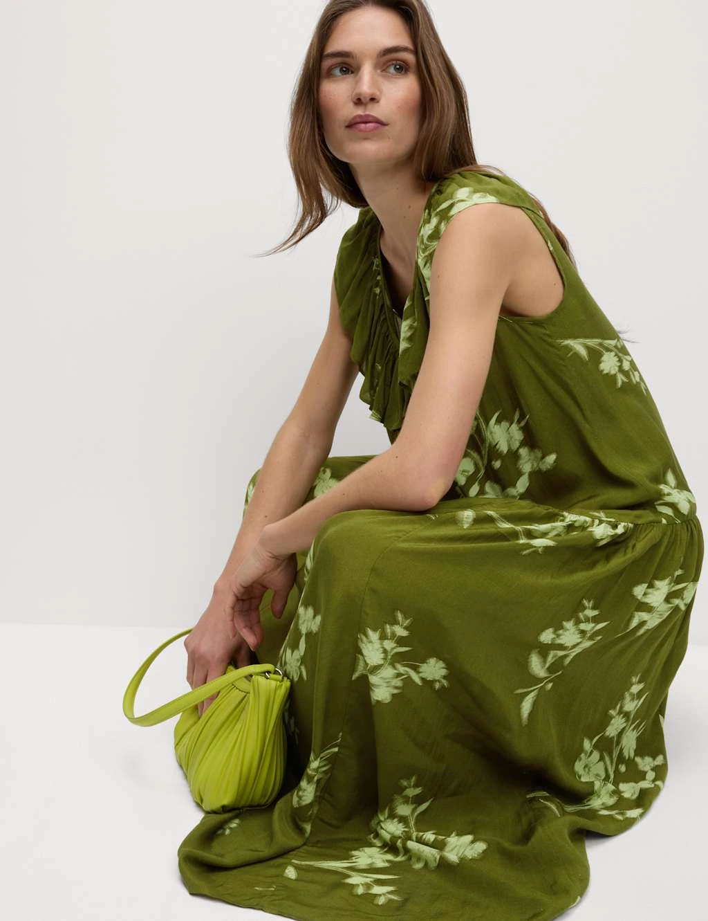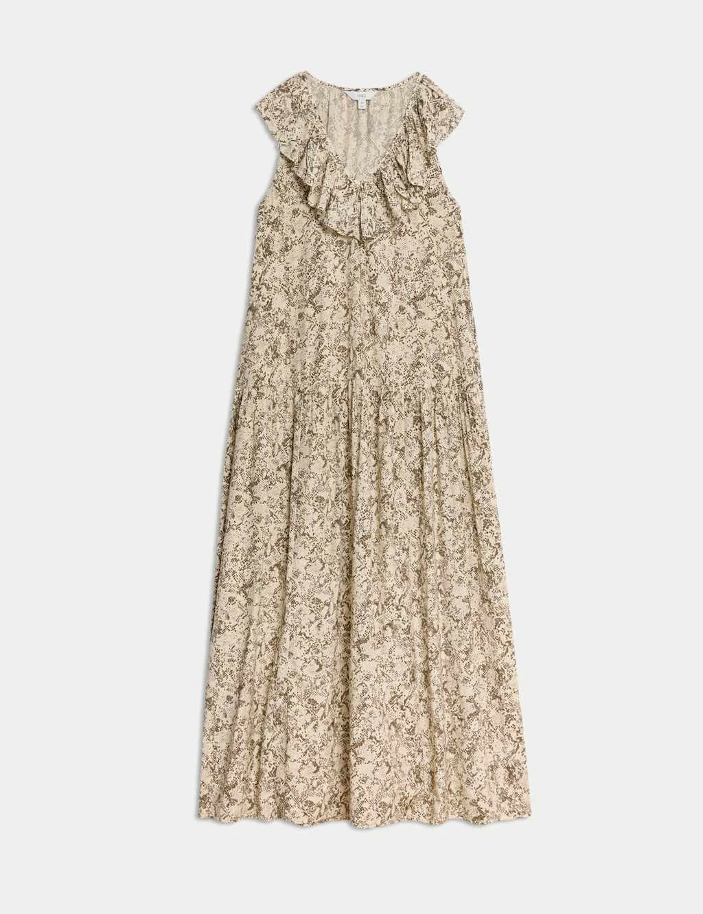 The all-over print of this midaxi dress makes it perfect for your smart-casual collection. It’s crafted in an easy relaxed fit, with a sleeveless silhouette to provide an airy feel. Frill detailing on the flattering v-neckline gives a feminine aesthetic. The drop waist leads to a tiered skirt that creates a neat finish. M&S Collection: easy-to-wear wardrobe staples that combine classic and contemporary styles.