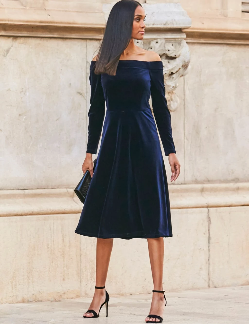 Make an entrance in this elegant velvet dress from Sosandar. This knee-length piece is tailored to a regular fit, and its timeless silhouette nips in at the waist before flaring out gently through the skirt. An off-shoulder Bardot neckline and split, crystal-studded long sleeves add statement finishing touches.