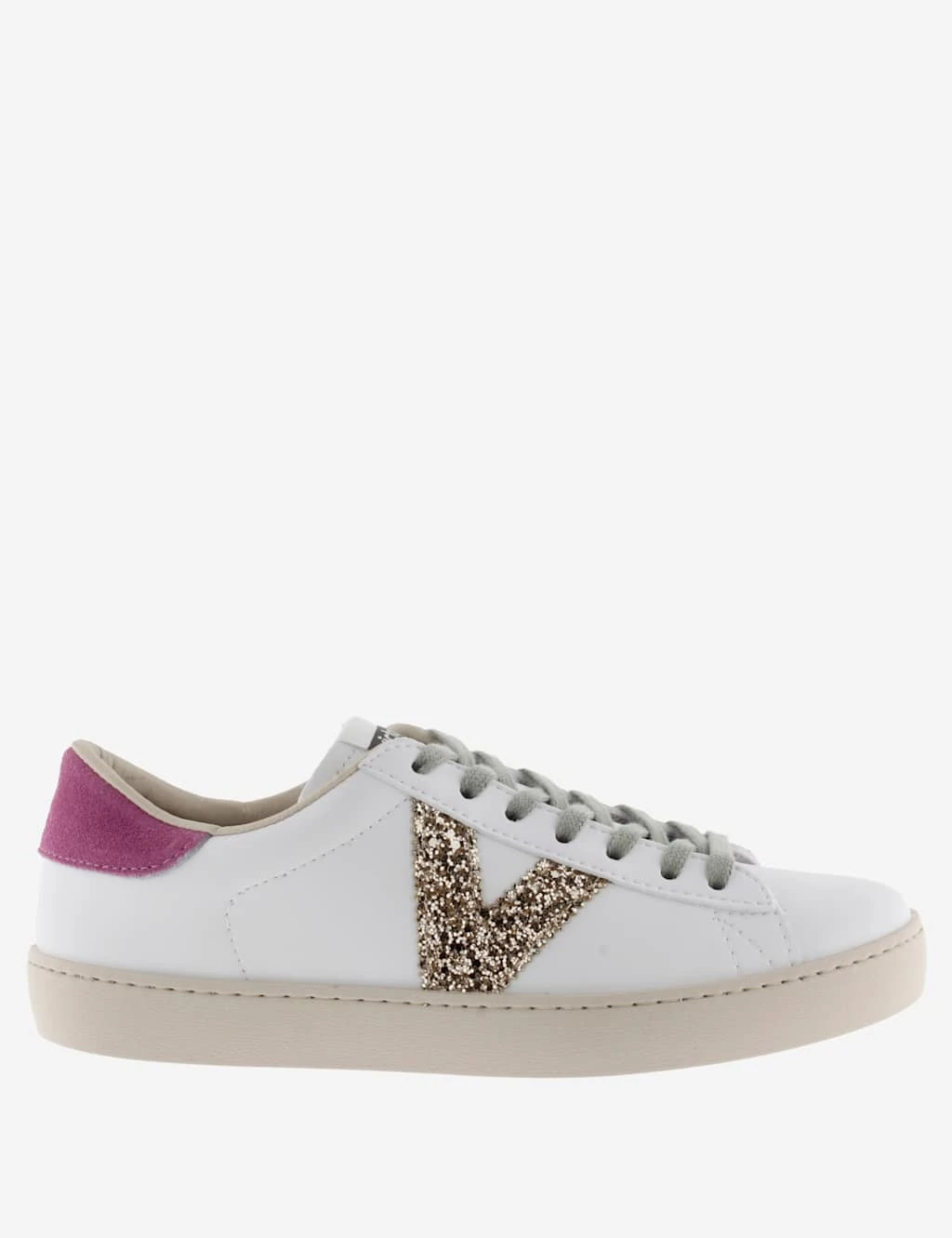 Add some sparkle to casual days with these trainers from Victoria. The lace-up pair features glittery branding on the upper for a statement look. A contrast heel cushion and sole adds a touch of sporty style.
