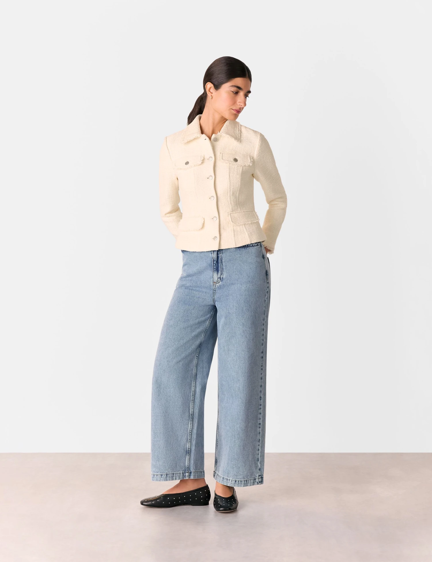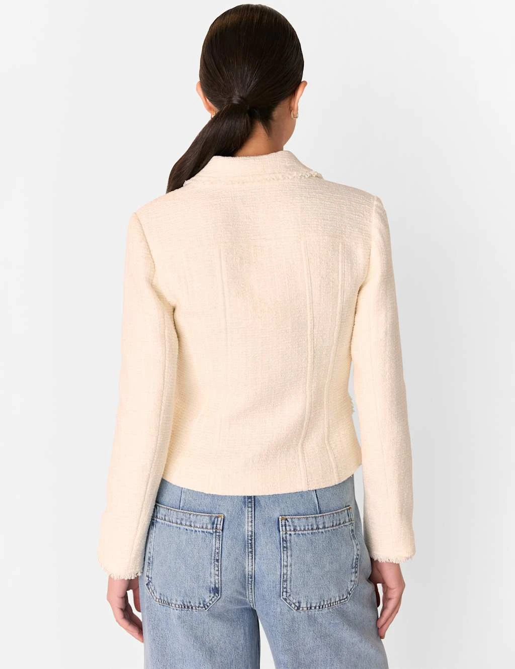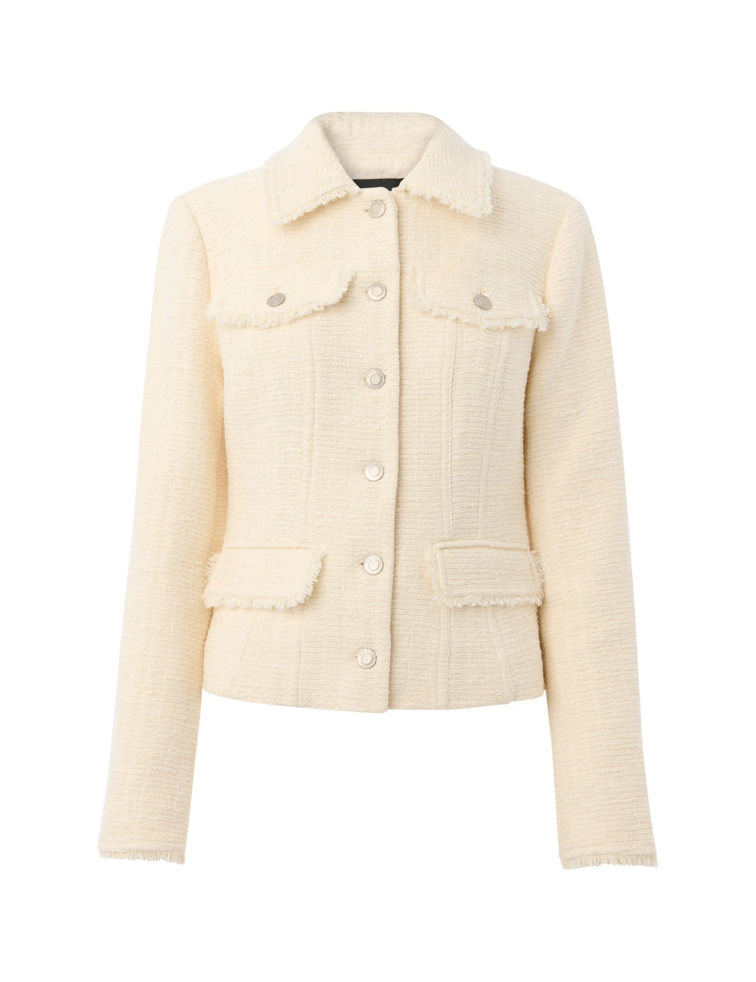 This classic Whistles blazer is crafted from cotton-blend boucle fabric for a gorgeously textured look. It’s made in a regular-fit single-breasted shape, with branded metal buttons running from the neck to the hem. Raw edges trim the collar, the cuffs and the four pocket flaps, while seam detailing adds feminine shaping.