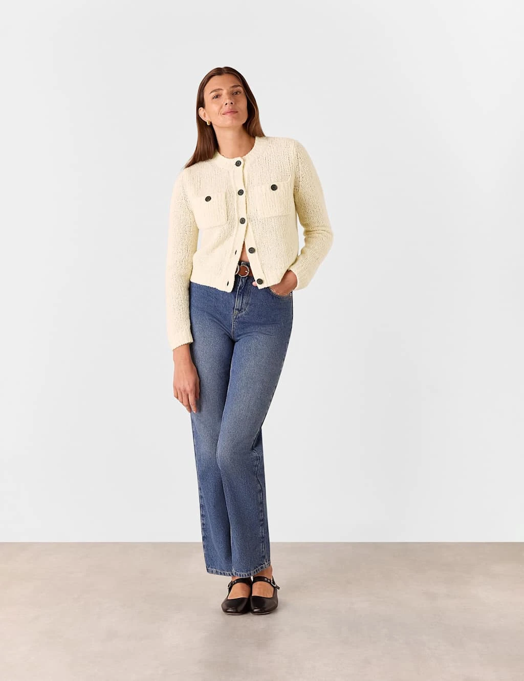 Crafted from yarn rich with wool, this cardigan from Whistles is a luxurious layering piece. It’s made in a regular fit, with a crew neckline and contrasting buttons on the fastening. A textured design adds to the cosy feel, while chest patch pockets with matching buttons are a standout feature.