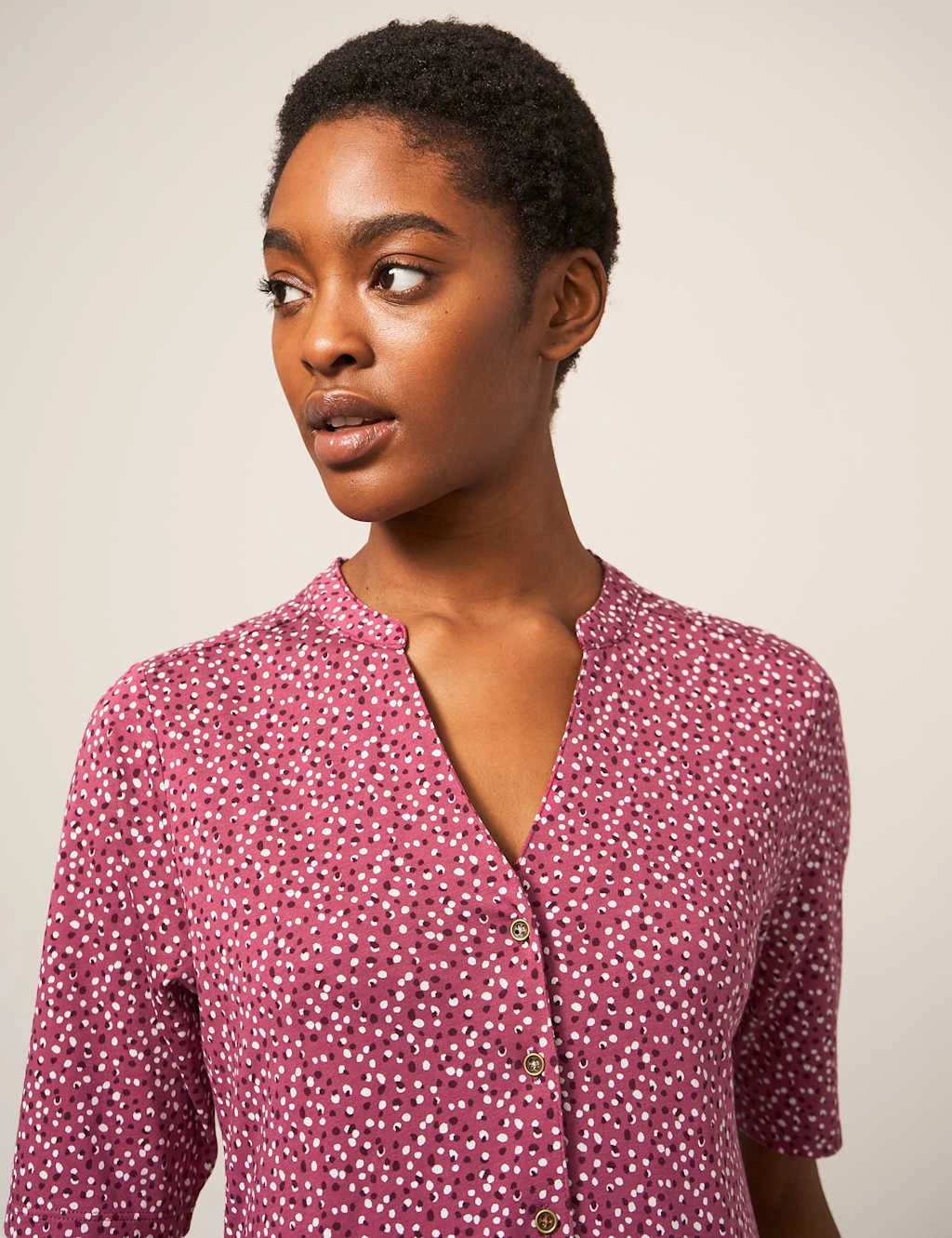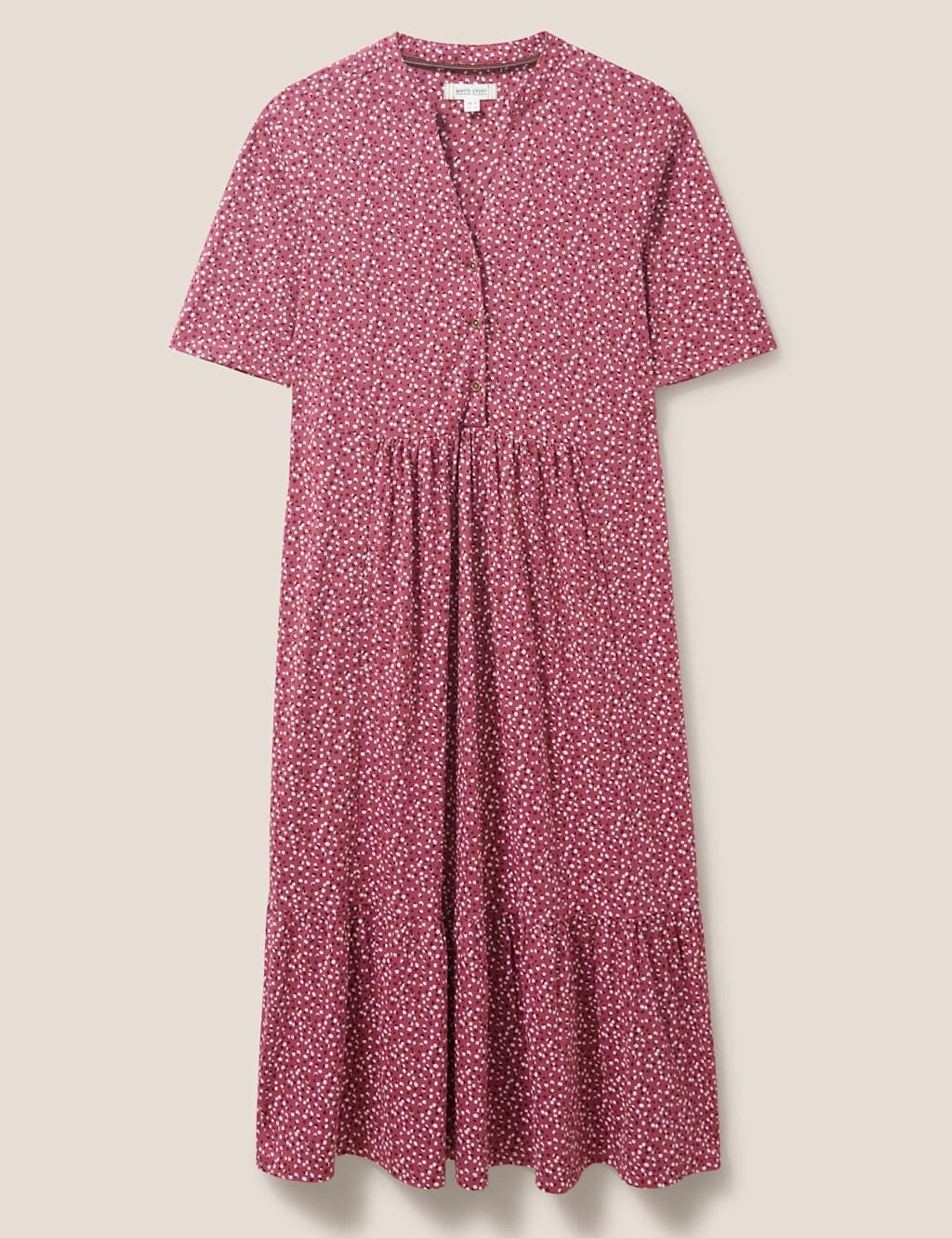 This cotton-blend jersey dress from White Stuff features a polka dot print for a playful look. It’s cut to a comfortable regular fit, with a tiered midi-length skirt that brings swishy movement. Short sleeves and a v-neckline create a breezy feel, while pockets in the side seams add a practical touch. The dress is complete with button fastenings at the front.