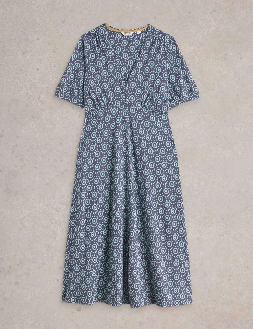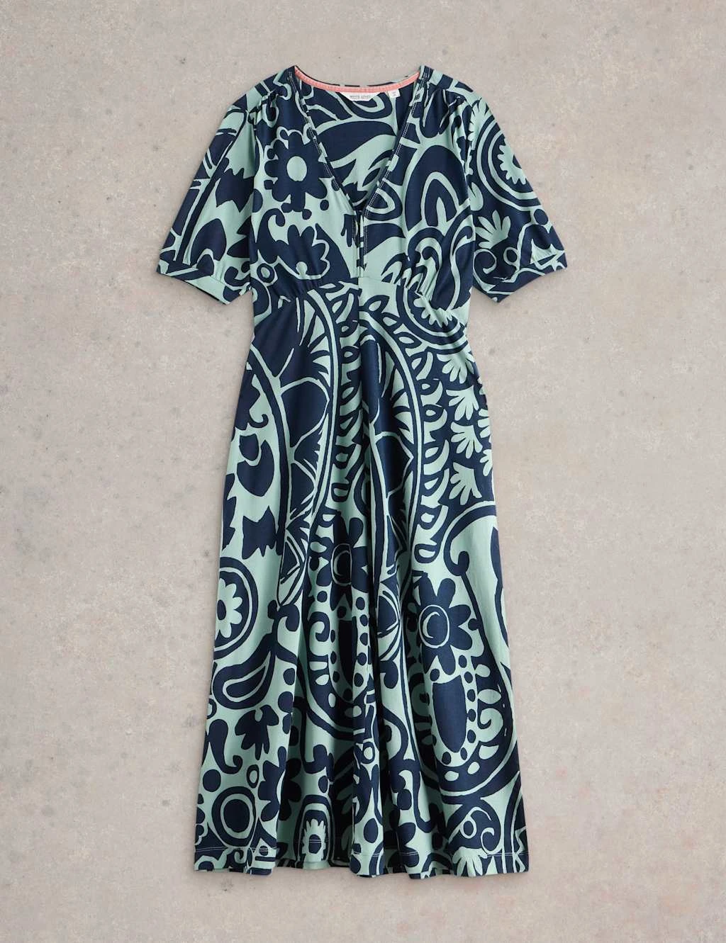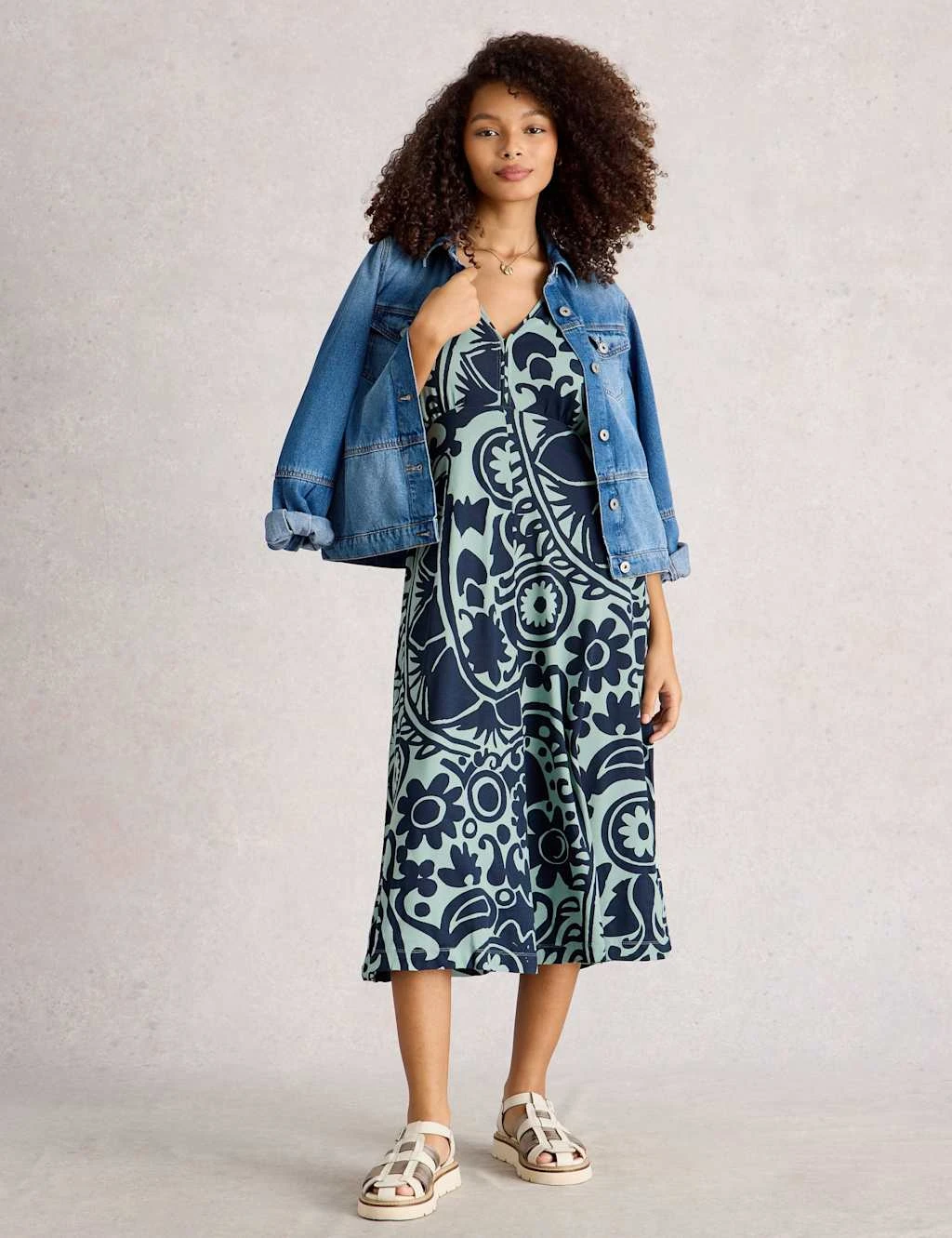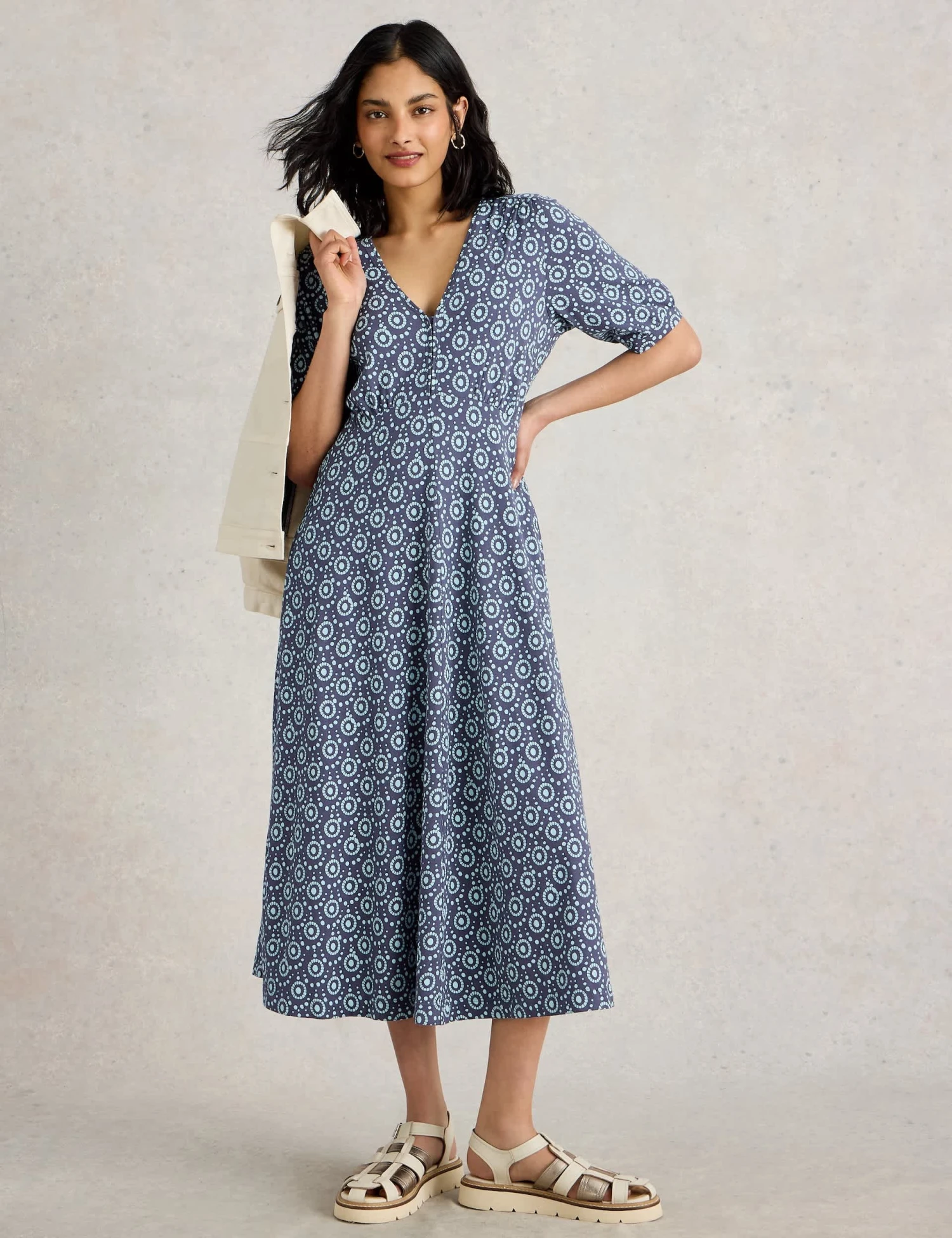 This cotton-blend jersey dress from White Stuff is a comfortable choice for casual days. It’s cut in a regular fit, with a flattering waisted silhouette. The short sleeves and v-neckline offer a laid-back, summery feel. A bold all-over print ensures a standout look, while the midi-length hem provides an elegant finish.