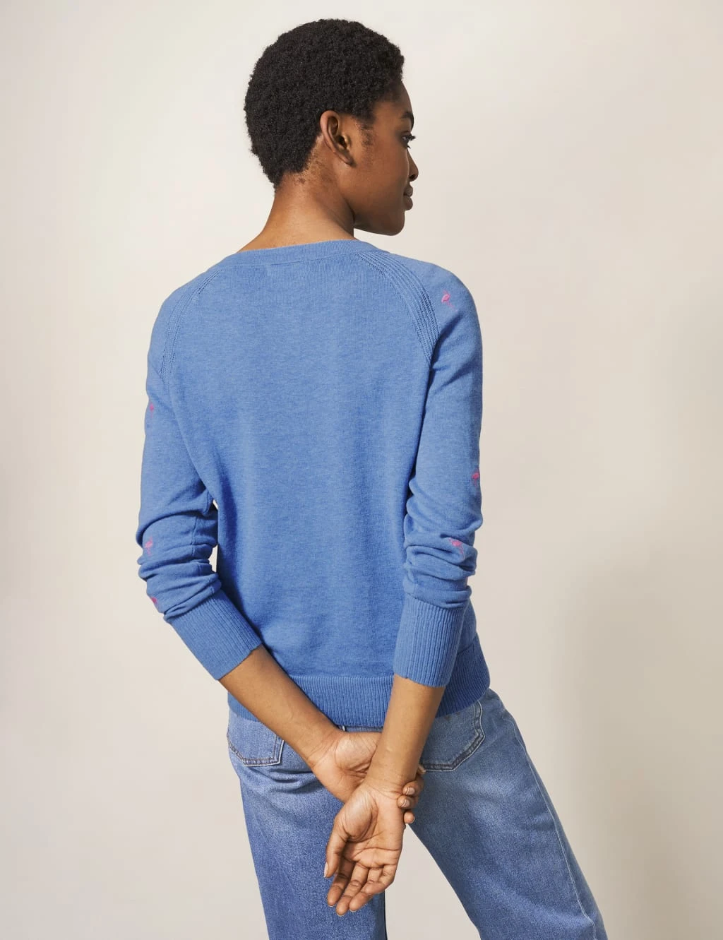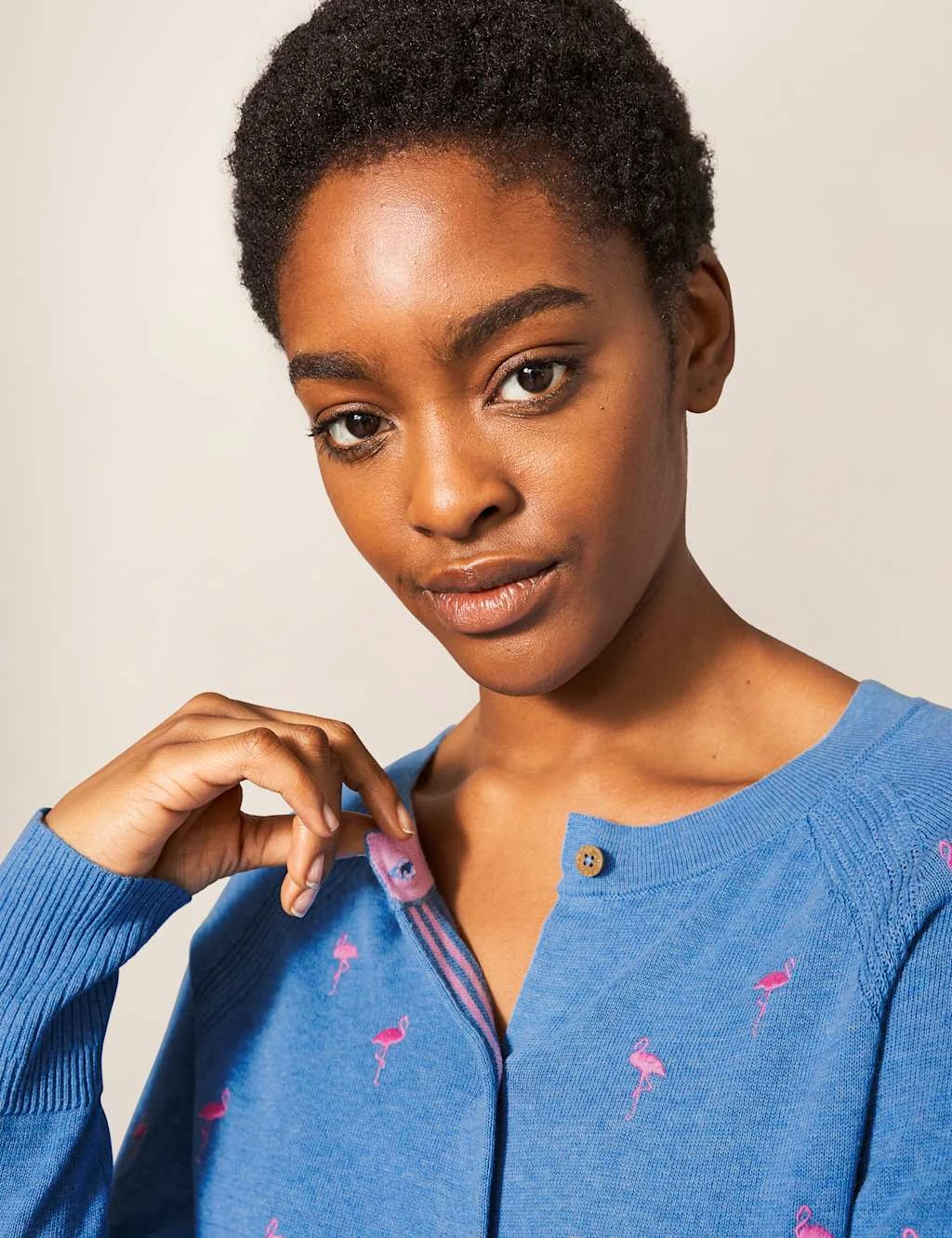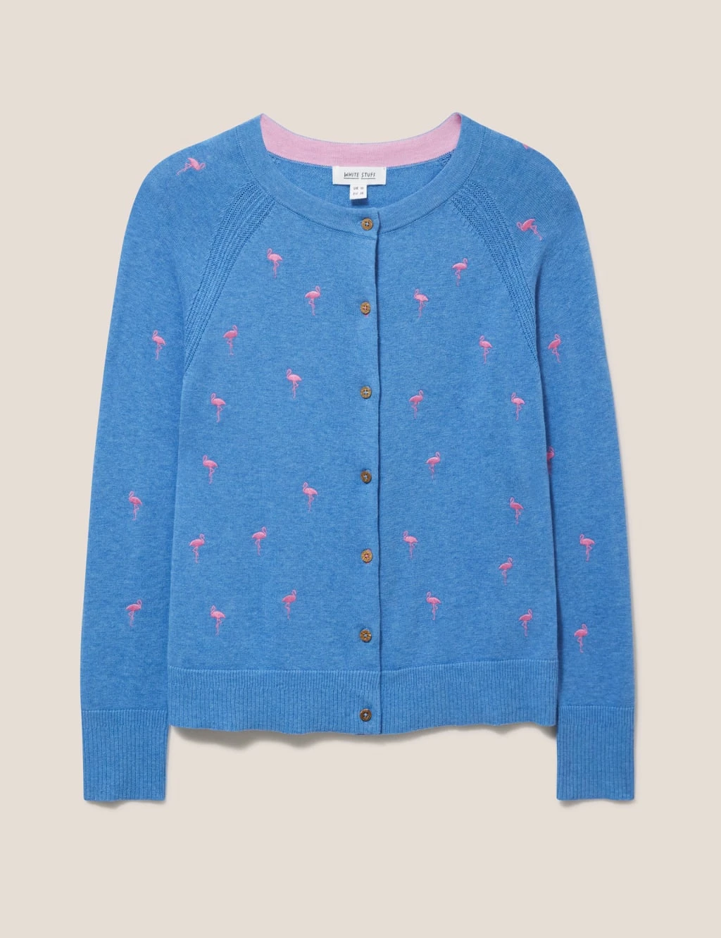 Tiny embroidered flamingos add a pretty detail to this organic cotton cardigan from White Stuff. It’s cut to a comfy regular fit with a button front. There’s a classic ribbed trim at the cuffs and hem, which is balanced by delicate knitted stripes at the shoulders.