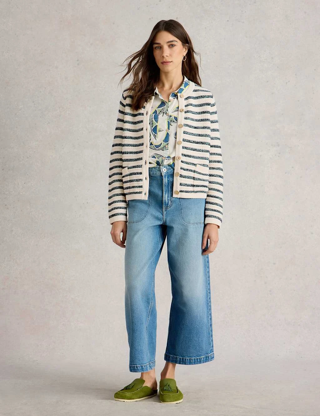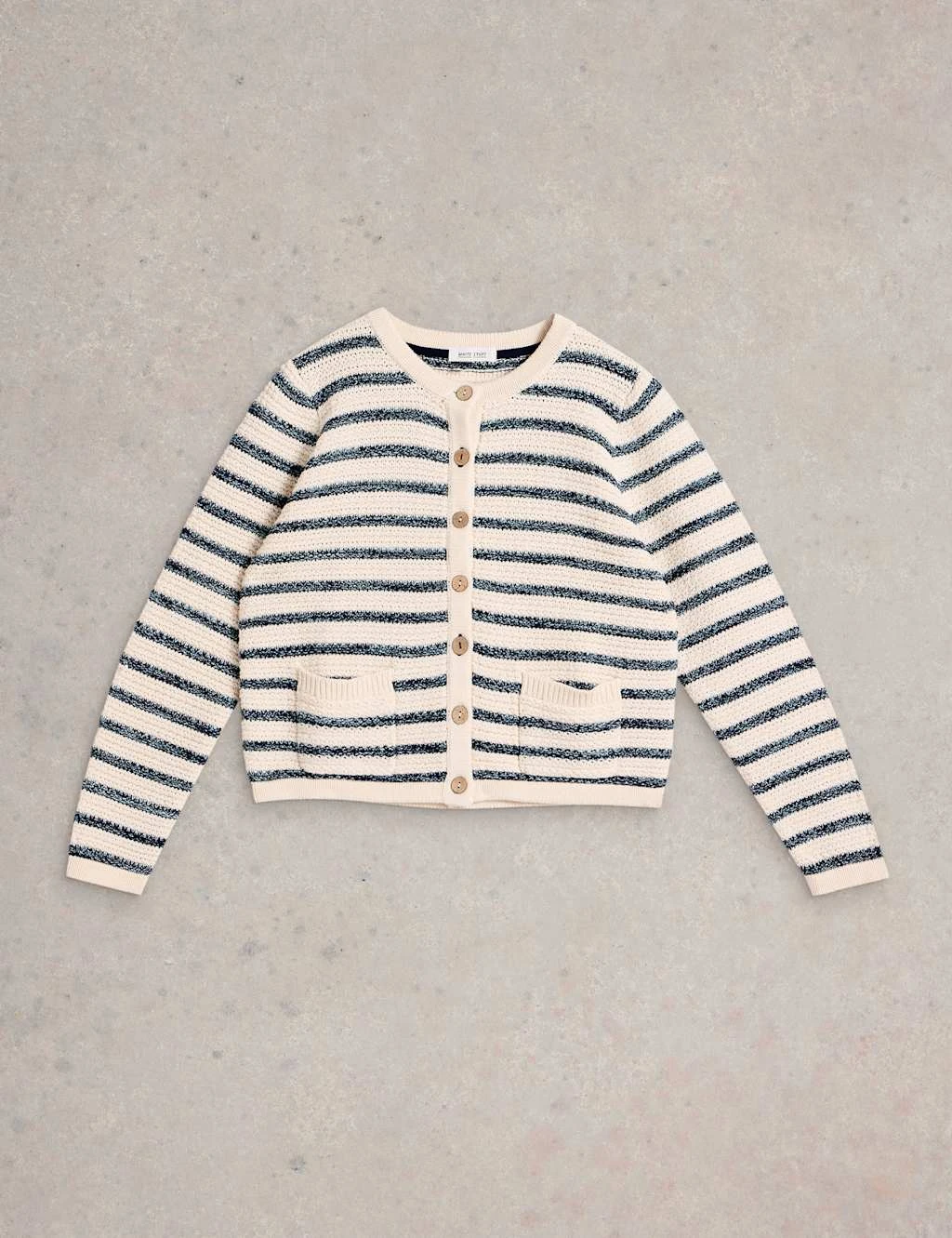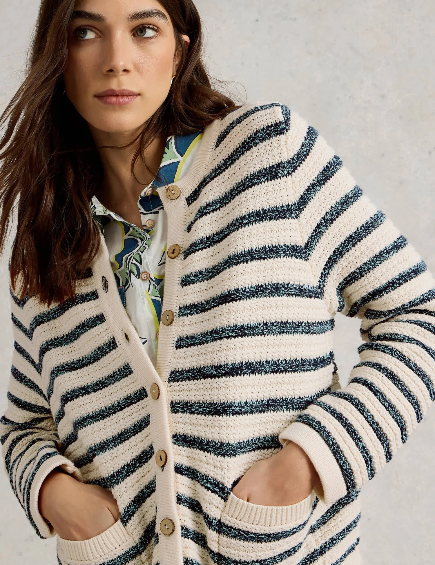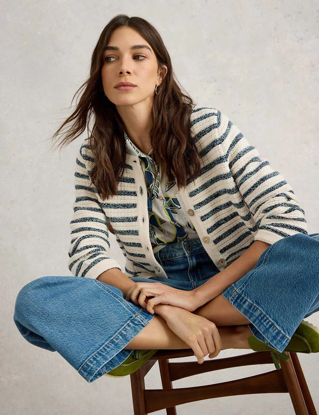 With its all-over striped design, this pure cotton cardigan from White Stuff is a timeless cold-weather style. It’s knitted in a comfy regular fit, with a neat crew neckline and front button fastenings. Two patch pockets adds a handy touch, while ribbed trims complete the piece.