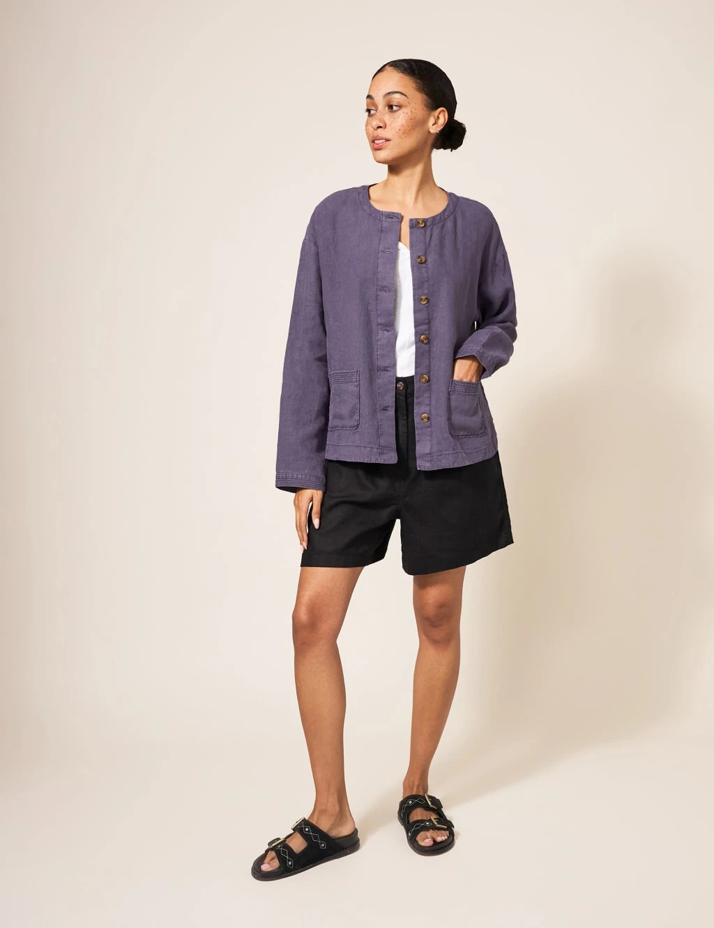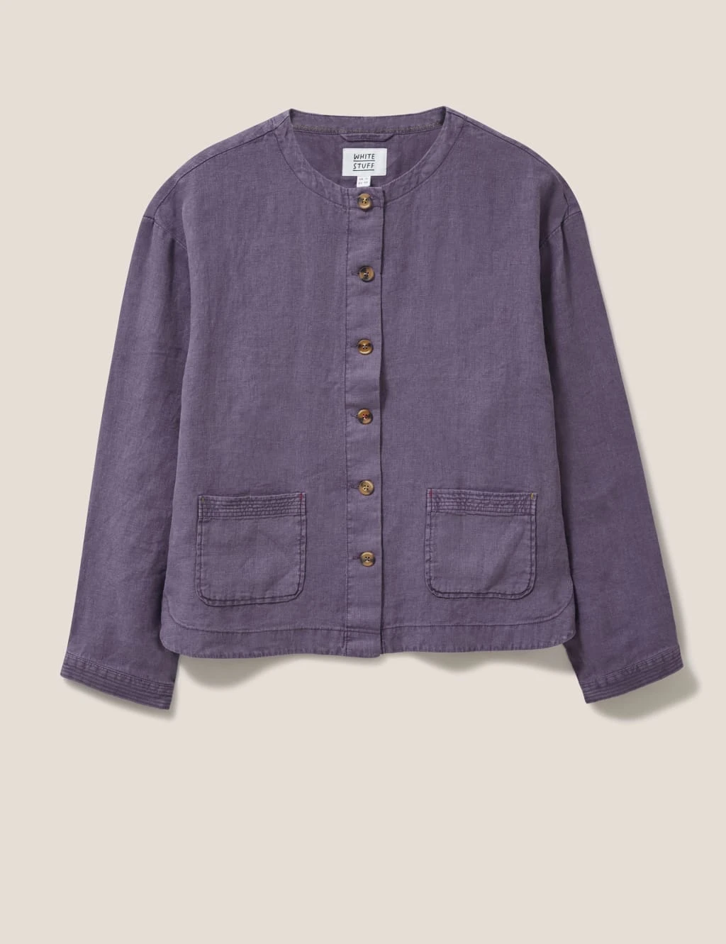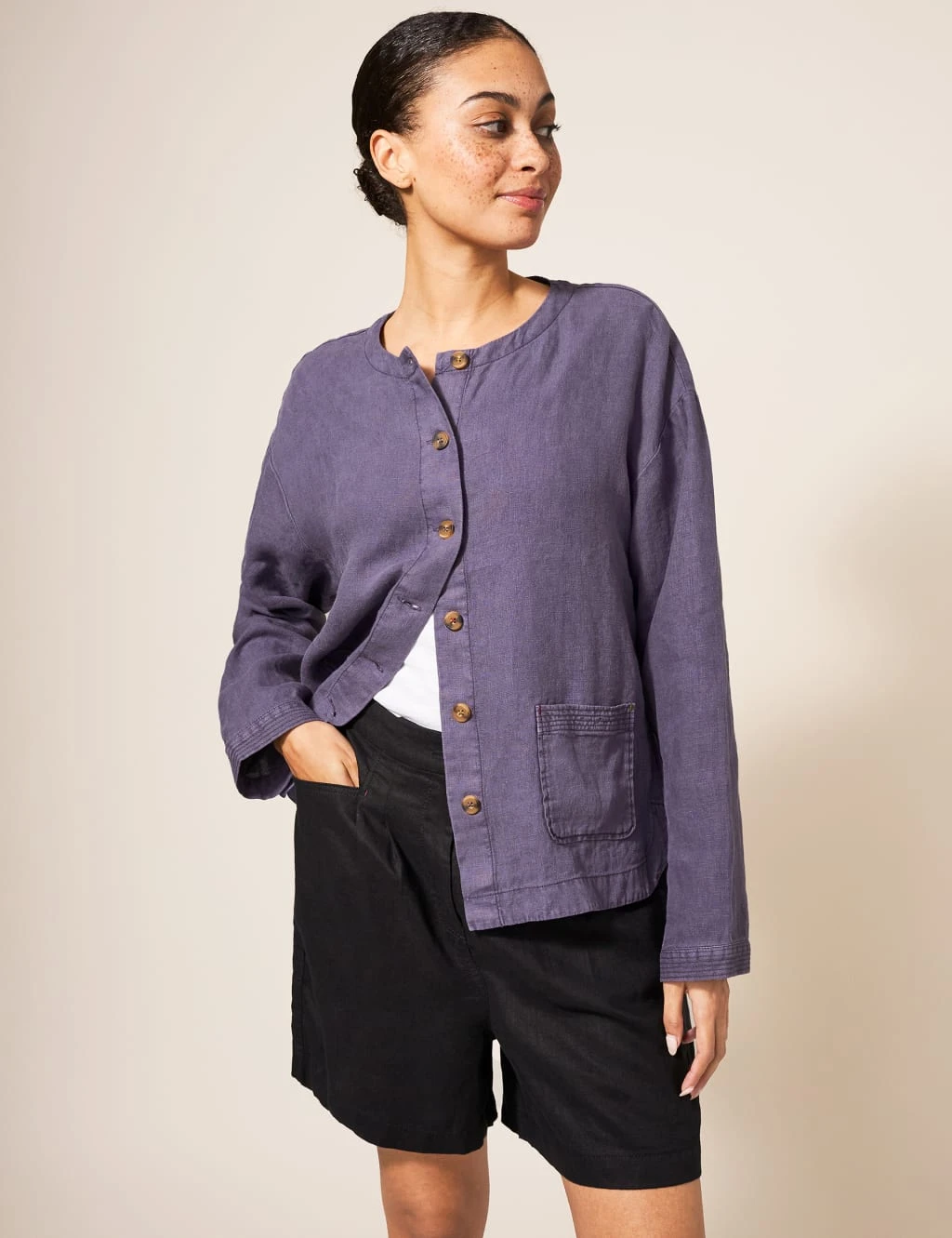 This pure linen jacket by White Stuff is your answer to lightweight layering on mild days. It’s made in a regular fit, with a neat round neckline and dropped shoulders for a laid-back feel. Mock-horn buttons down the front add subtle contrast. Extra details include patch pockets and cuffs with linear stitching, plus curved side splits at the hem.