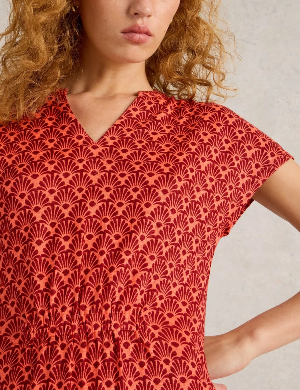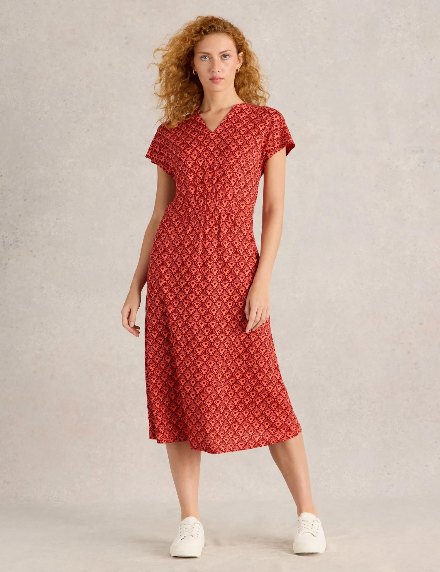 This White Stuff dress is crafted from pure linen jersey for a light and breathable feel. It’s cut to an easy relaxed fit, with a feminine v-neckline and breezy short sleeves. The waist is gently cinched in, before falling to a flowing midi-length skirt. A vibrant all-over print completes the design.
