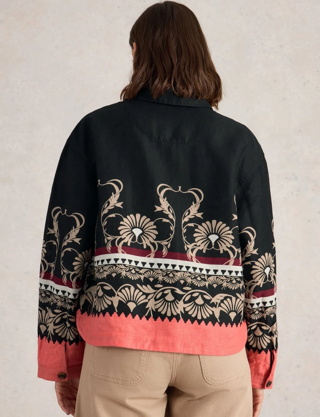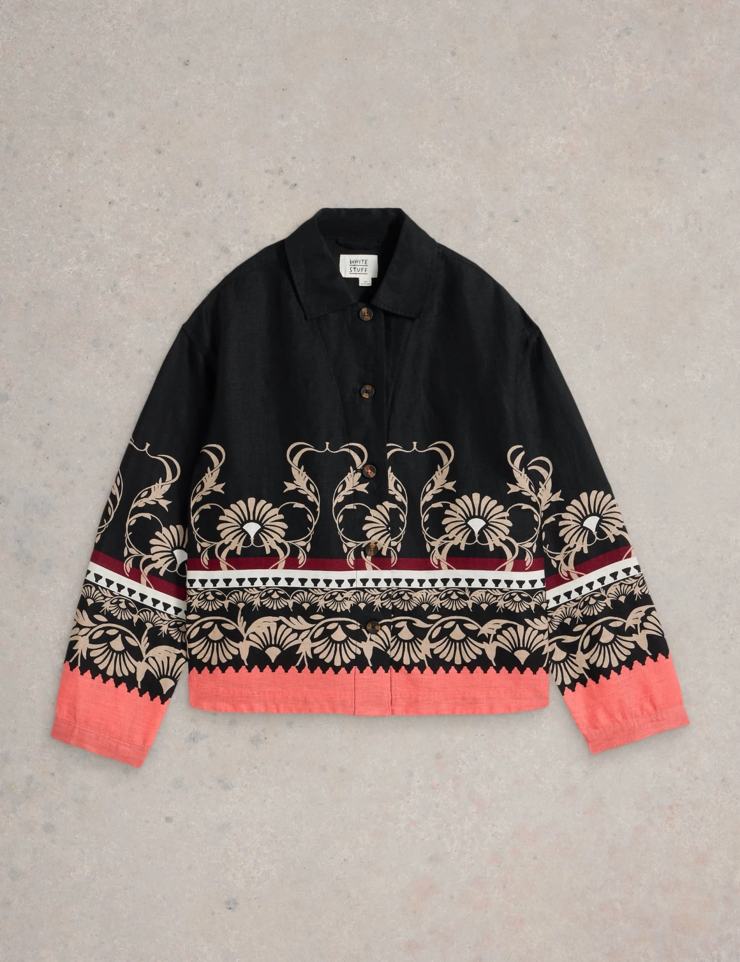 Layer up in style with this printed pure linen jacket from White Stuff. It’s designed in a relaxed fit for a laidback look. The button-up style features a sharp collar and neat button cuffs. A naturalistic print with contrast hem gives this piece a bold finish.