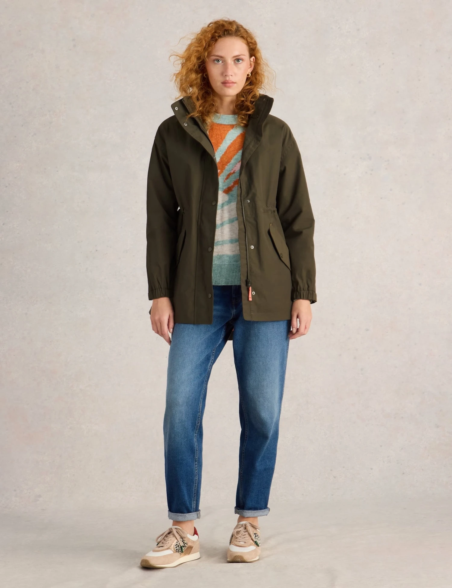 Stay dry in style with this waterproof raincoat from White Stuff. It’s made in a regular fit, with a funnel neck for extra coverage. An internal waistband creates a flattering shape, along with a curved hem at the back. Two large patch pockets provide plenty of space for your essentials, while contrast poppers on the cuffs add an eye-catching pop of colour. This style is lined.