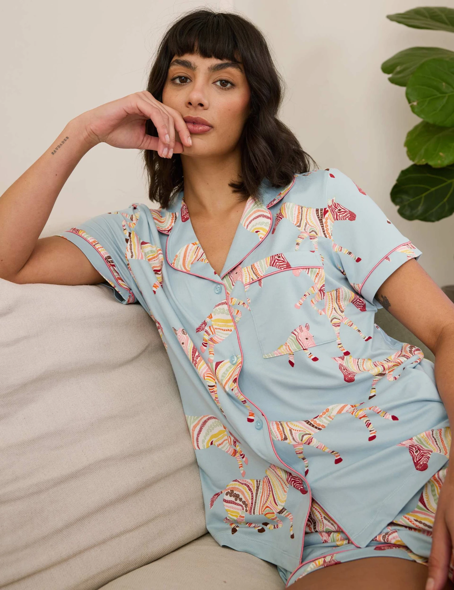 Bring a playful touch to your nightwear with these pyjamas from Chelsea Peers, decorated with a hand-drawn zebra print. This regular fit set includes a short-sleeved shirt with a button-through fastening, stylish revere collar and chest pocket. The matching shorts have an elasticated waist for flexible comfort and handy side pockets. Contrasting piped trims add a neat finish.